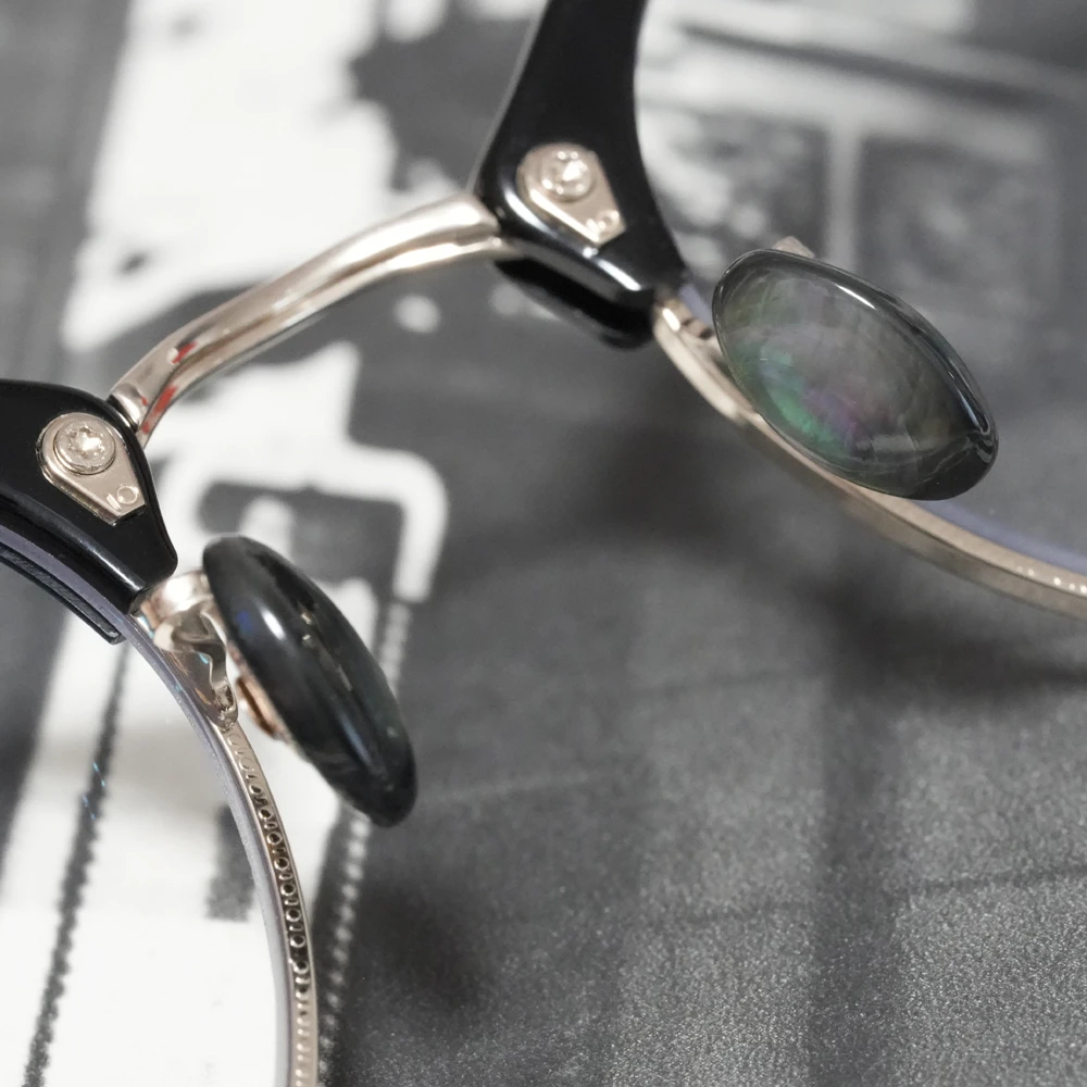 裏側の平座金は缶のプルタブをモチーフとしたパーツで、ブロー部分の広がりを防止する働きがあります。丸四角のシルバー925製のリベット、チタン製リムの背面に施された10柄のレリーフなども見所です。全てのパーツが織りなす統一感、シンプルなレンズシェイプの美しさが際立ちます。