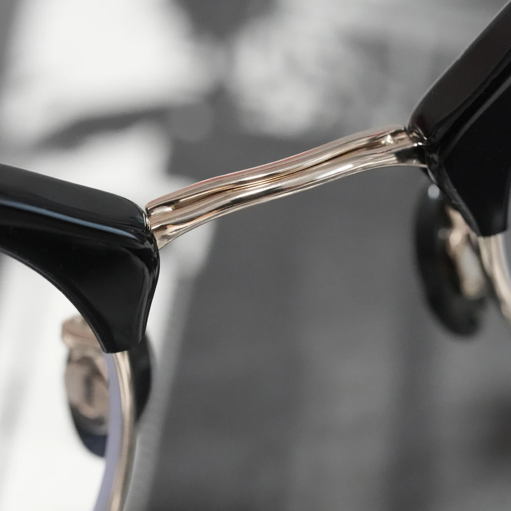 クラシックなブローフレームとは一線を画すモダンで洗練された雰囲気のパントシェイプのサーモントブローフレーム。プラスチック部分は日本の伝統的素材であるセルロイドを使用していますが、薄く仕上げることで、むしろ軽やかな雰囲気が感じられます。