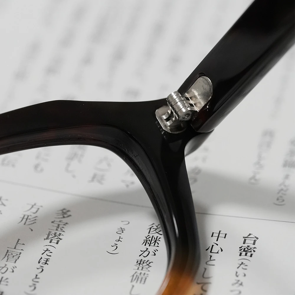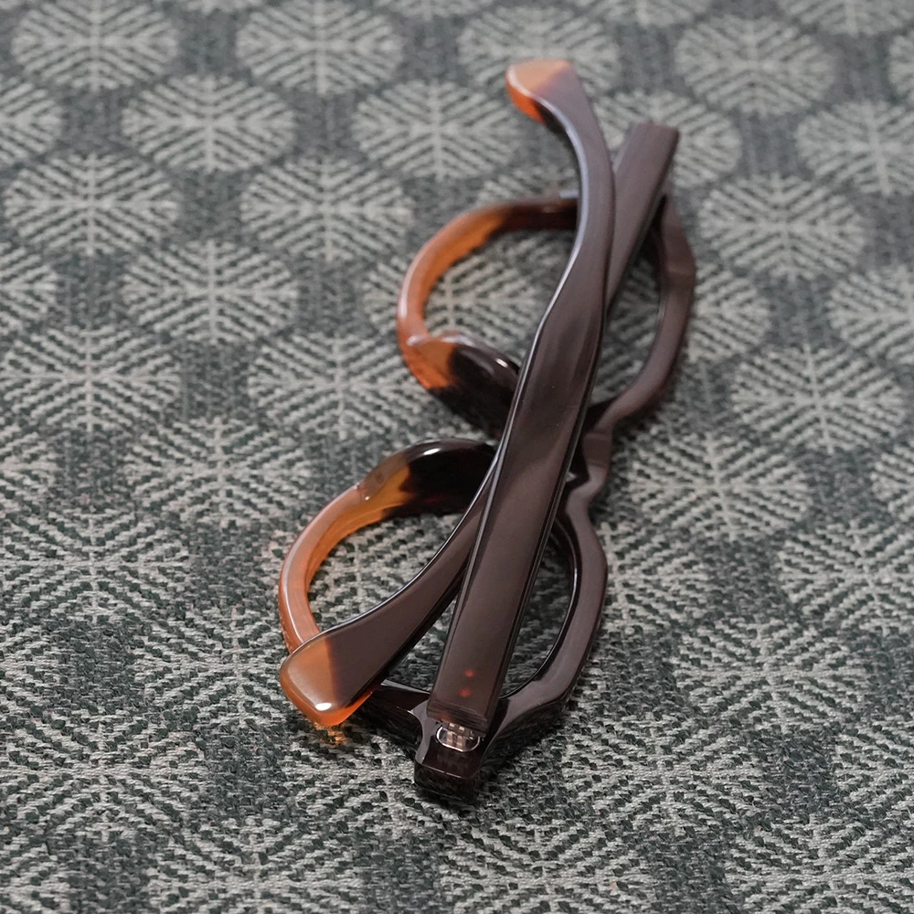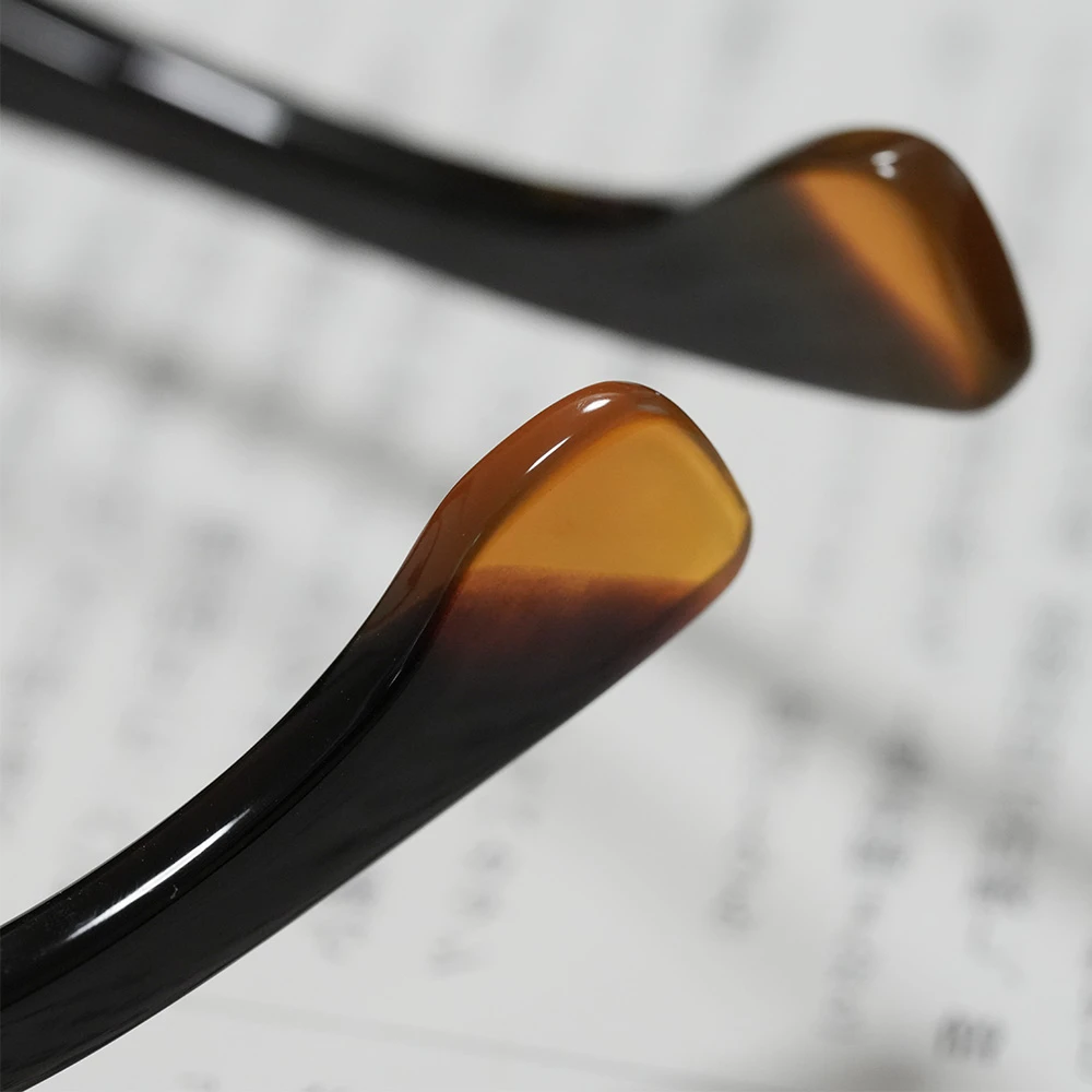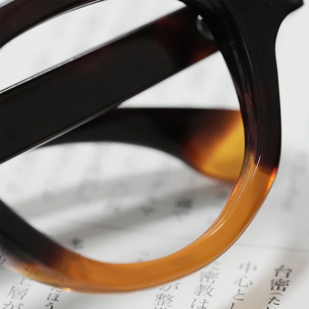 本べっ甲メガネ オール甲 並甲 オレンジ甲ハーフ DK8821 880,000円 ※オール甲の本べっ甲メガネの通信販売は行っておりません。在庫確認などお気軽にお問い合わせ下さい。 在庫切れ/お問い合わせ下さい 商品コード: 131071 カテゴリー: メガネ タグ: べっ甲, メガネ, 多角形 ブランド: 本べっ甲メガネ 詳細 お問い合わせ 詳細 上部に並甲(並トロ甲)、下部に希少なオレンジ甲を使用した七角形シェイプのモダンな本べっ甲メガネ。熟練のべっ甲職人の手により1点のみ作製された銀座鼈甲眼鏡(ミツメドウ)のオリジナルデザインです。斜めのラインを意識して配色は意図的に行われています。また、べっ甲メガネのフロント厚は一定なものがほとんどですが、厚みを5mmから7mmに変えることにより奥行きが感じられます。クラシックなキーホール型ブリッジ、モダンエンドの切り替えもスタイリッシュ。蝶番金具は合金を使用しています。レンズ横幅48mm 縦幅38mm レンズ間距離21mm フロント幅147mm 本べっ甲メガネのページに戻る 氏名 メールアドレス(必須) 題名 お問い合わせ内容をご記載下さい(必須) 関連商品 水島眼鏡 MI-0954 85,800円 – 92,400円価格帯: 85,800円 – 92,400円 在庫切れ/お問い合わせ下さい この商品には複数のバリエーションがあります。 オプションは商品ページから選択できます 水島眼鏡 MI-444 66,000円 お買い物カゴに追加 隆織 TO-023 44,000円 お買い物カゴに追加 この商品には複数のバリエーションがあります。 オプションは商品ページから選択できます ファクトリー900 FA-204 68,200円 お買い物カゴに追加