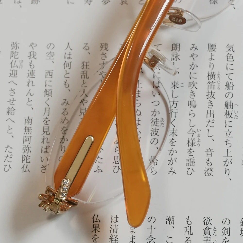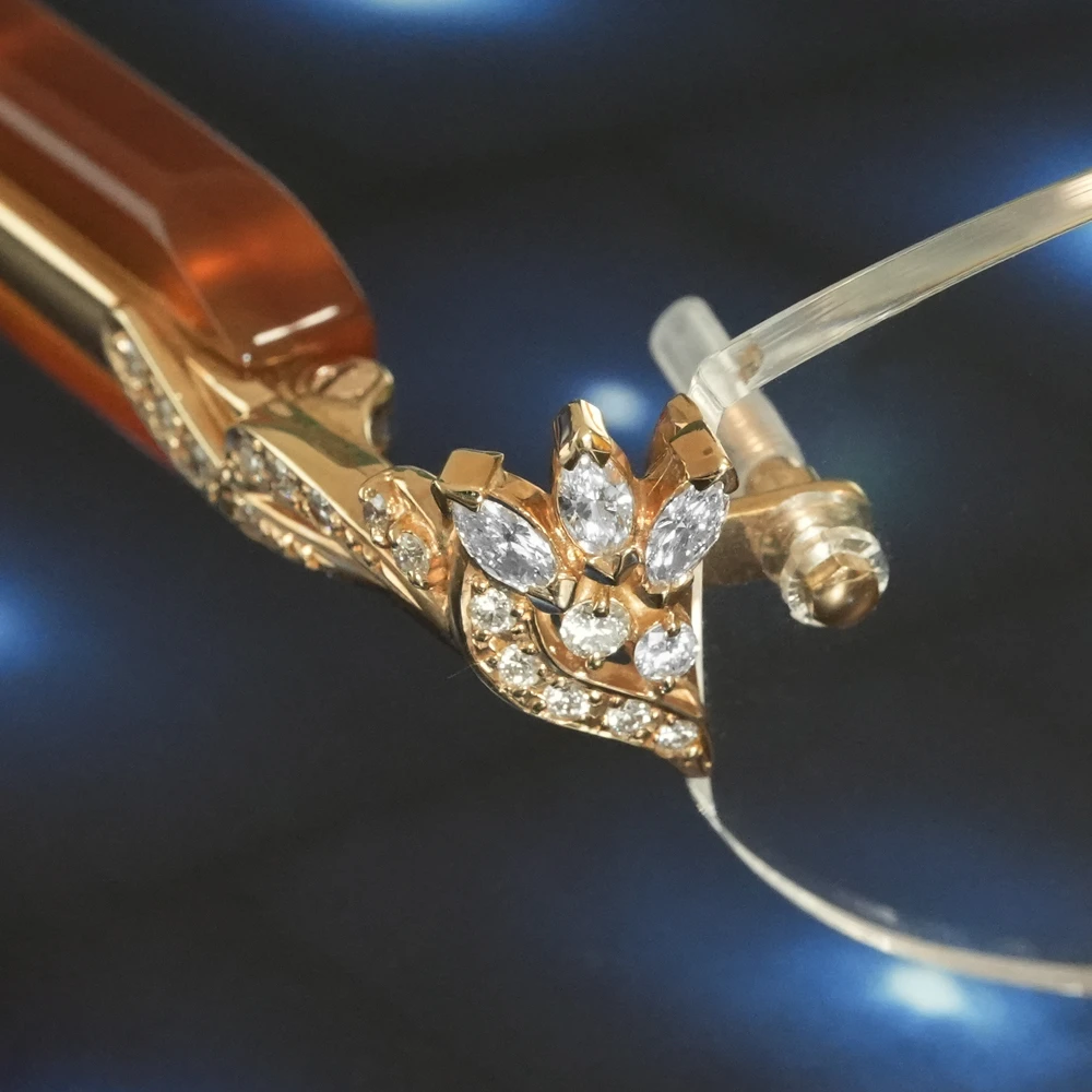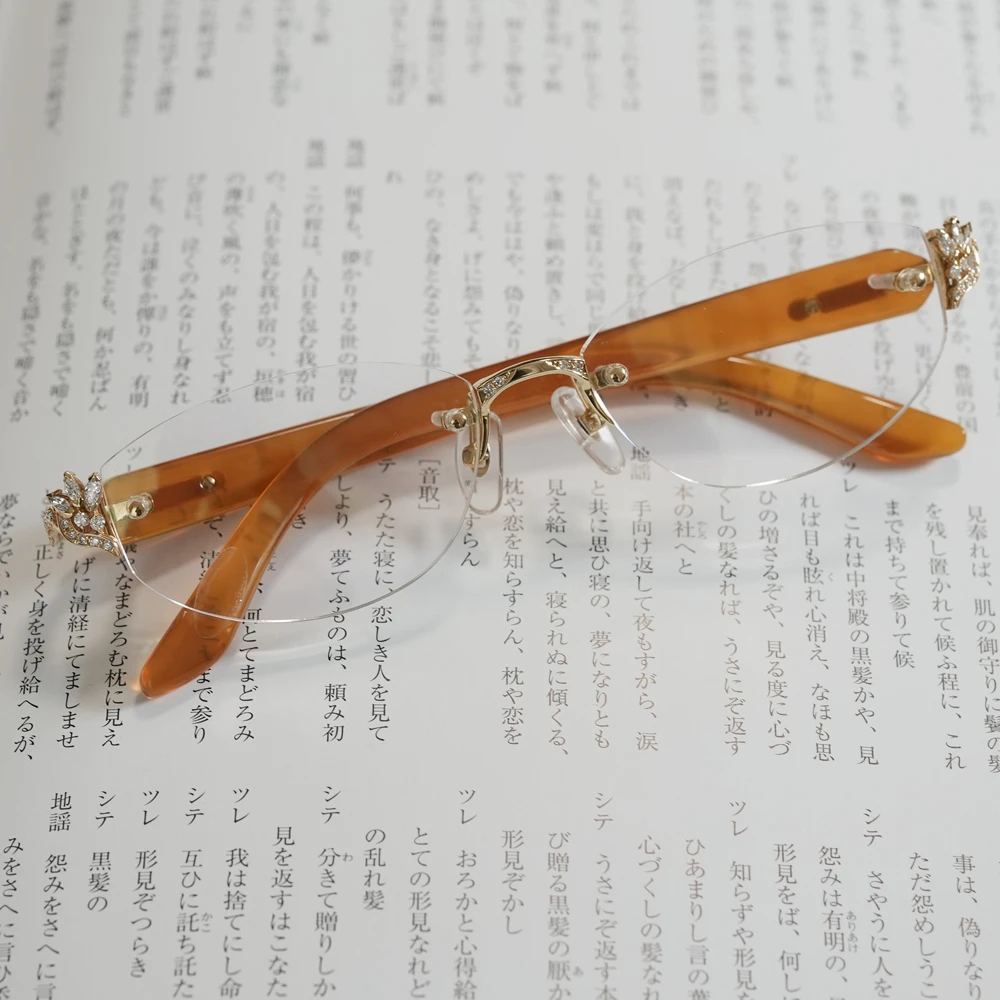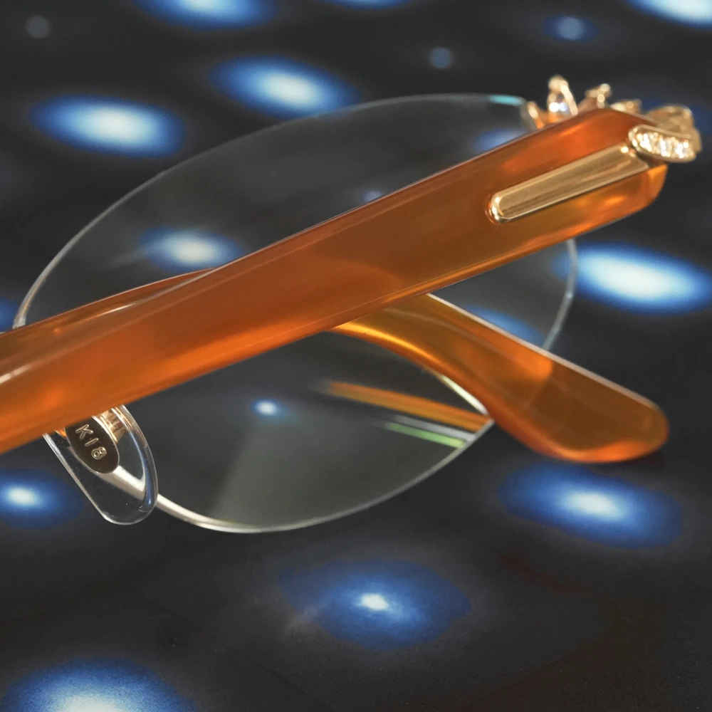 横顔を上品に彩る希少なオレンジ甲(本べっ甲)をテンプルに使用したコンビネーションのリムレスフレーム。蝶番部分には片側19個、ブリッジには4個のダイヤモンドがセットされており、目元を華やかなに、鮮やかに演出します。イエローゴールドとオレンジ甲が完璧な調和を見せる特別なメガネです。