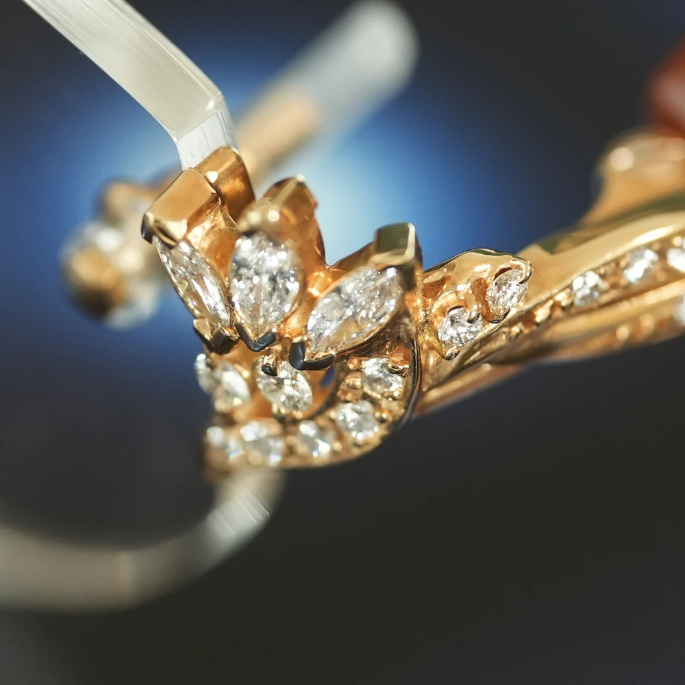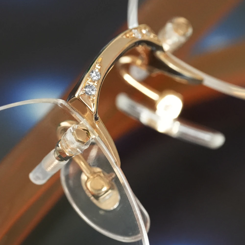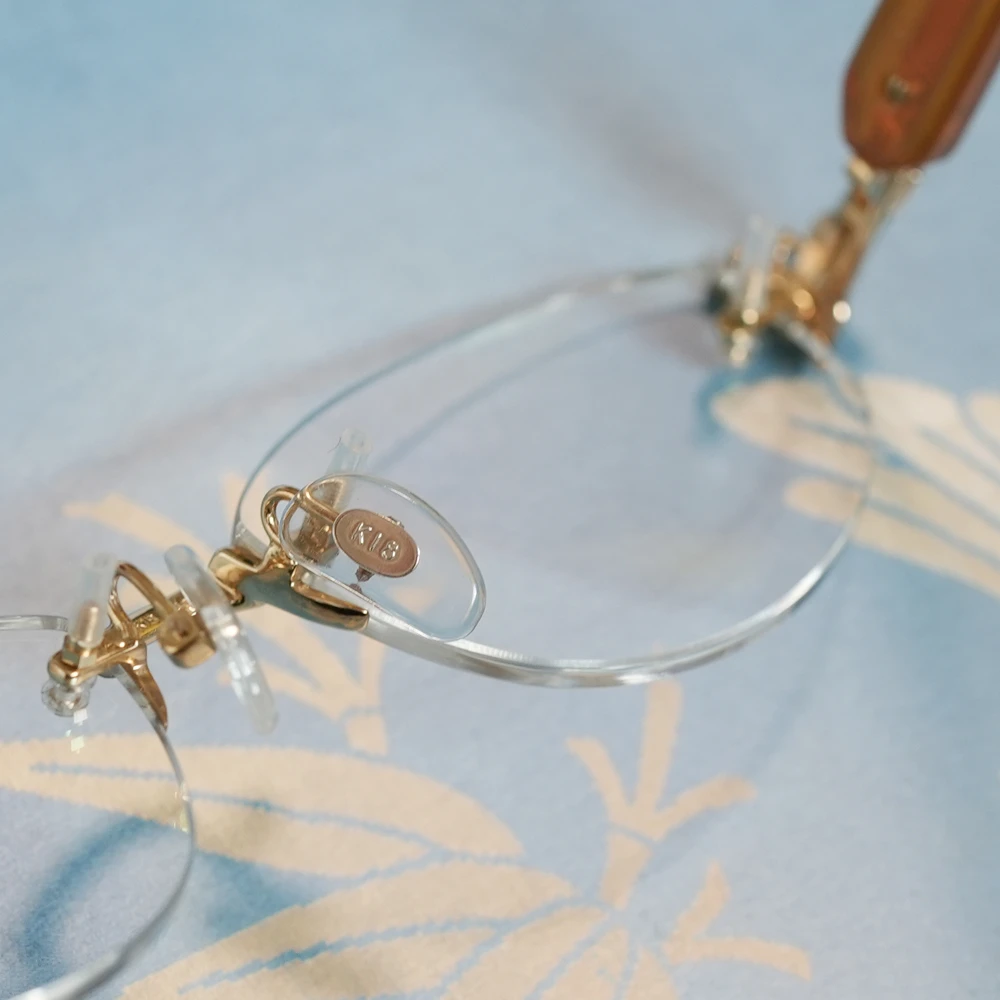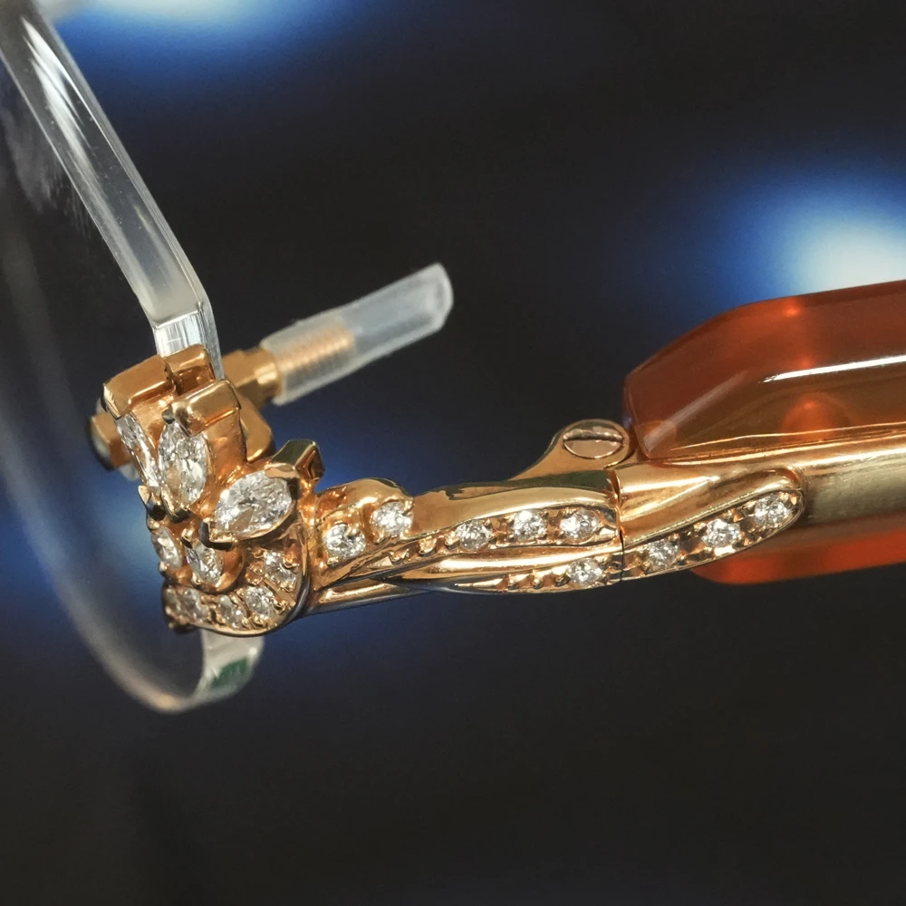 横顔を上品に彩る希少なオレンジ甲(本べっ甲)をテンプルに使用したコンビネーションのリムレスフレーム。蝶番部分には片側19個、ブリッジには4個のダイヤモンドがセットされており、目元を華やかなに、鮮やかに演出します。イエローゴールドとオレンジ甲が完璧な調和を見せる特別なメガネです。
