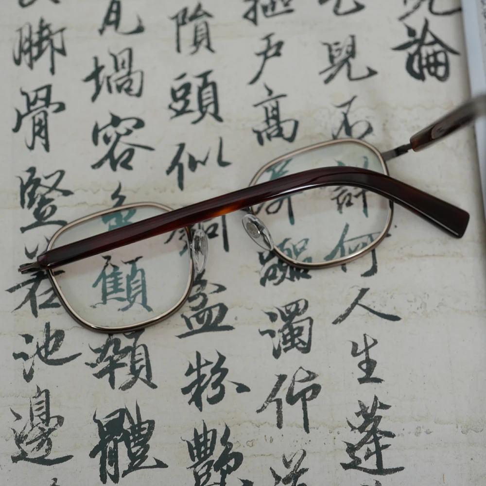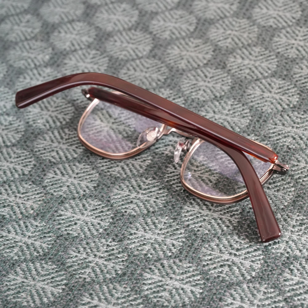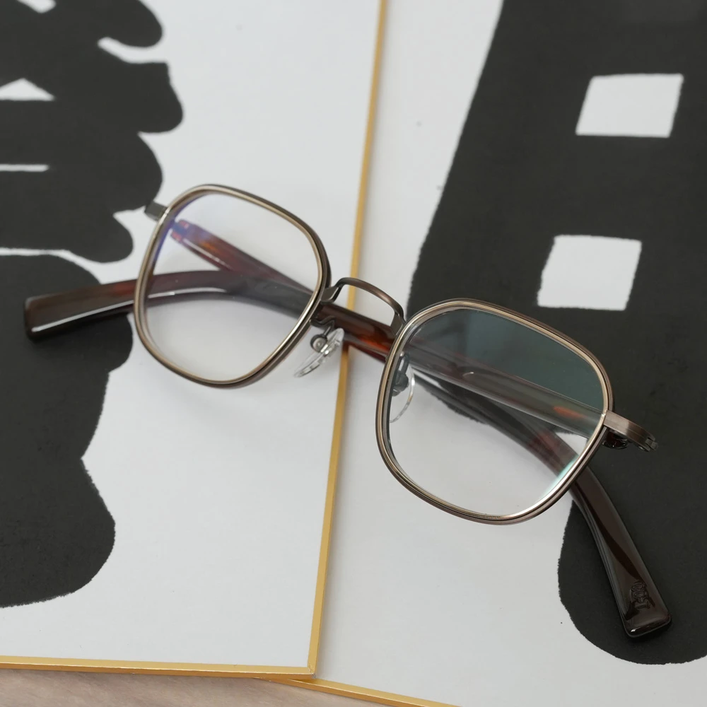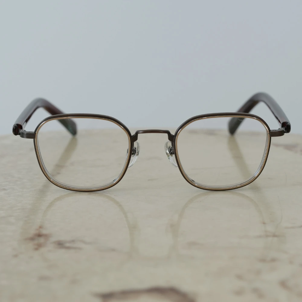 日本で最高峰のチタン加工技術を持つ工場で作製されたダブルチタン構造のスクエアシェイプのフロントとべっ甲(並トロ甲)素材のテンプルを組み合わせたコンビネーションフレーム。クラシックなフロントシェイプですが、マットブラウンとシルバーの内リムを組み合わせた最先端でモダンな構造。べっ甲ならではの落ち着いた上質感と掛け心地の良さは両立した特別なメガネです。べっ甲部分には汗などによる劣化を防ぐコーティング(ベッコート)が施されています。