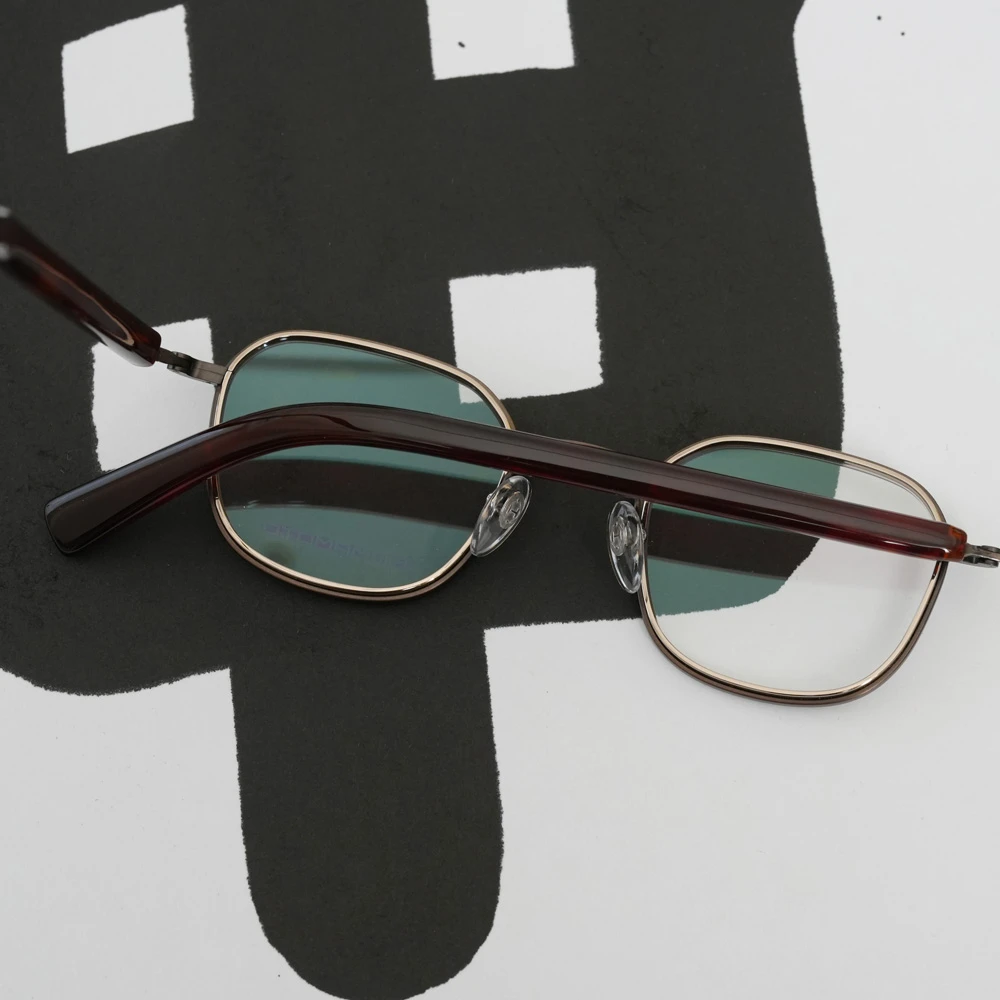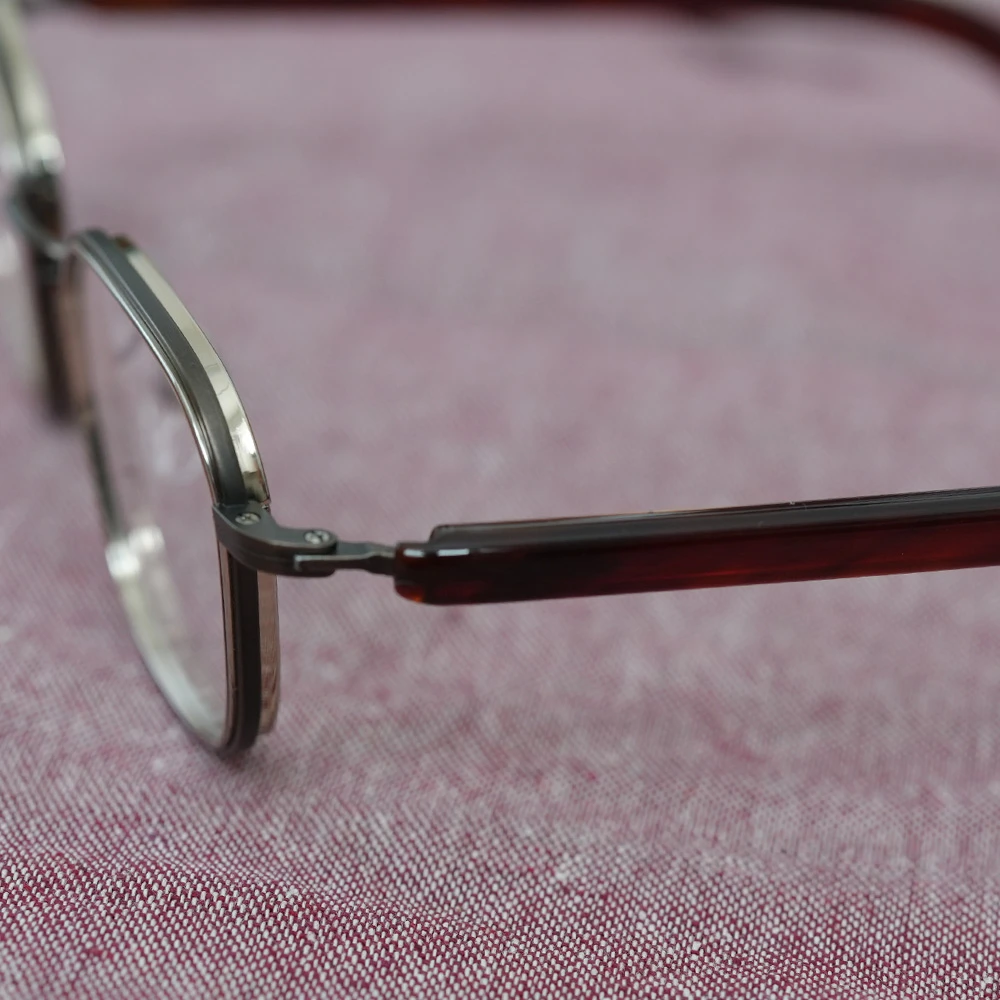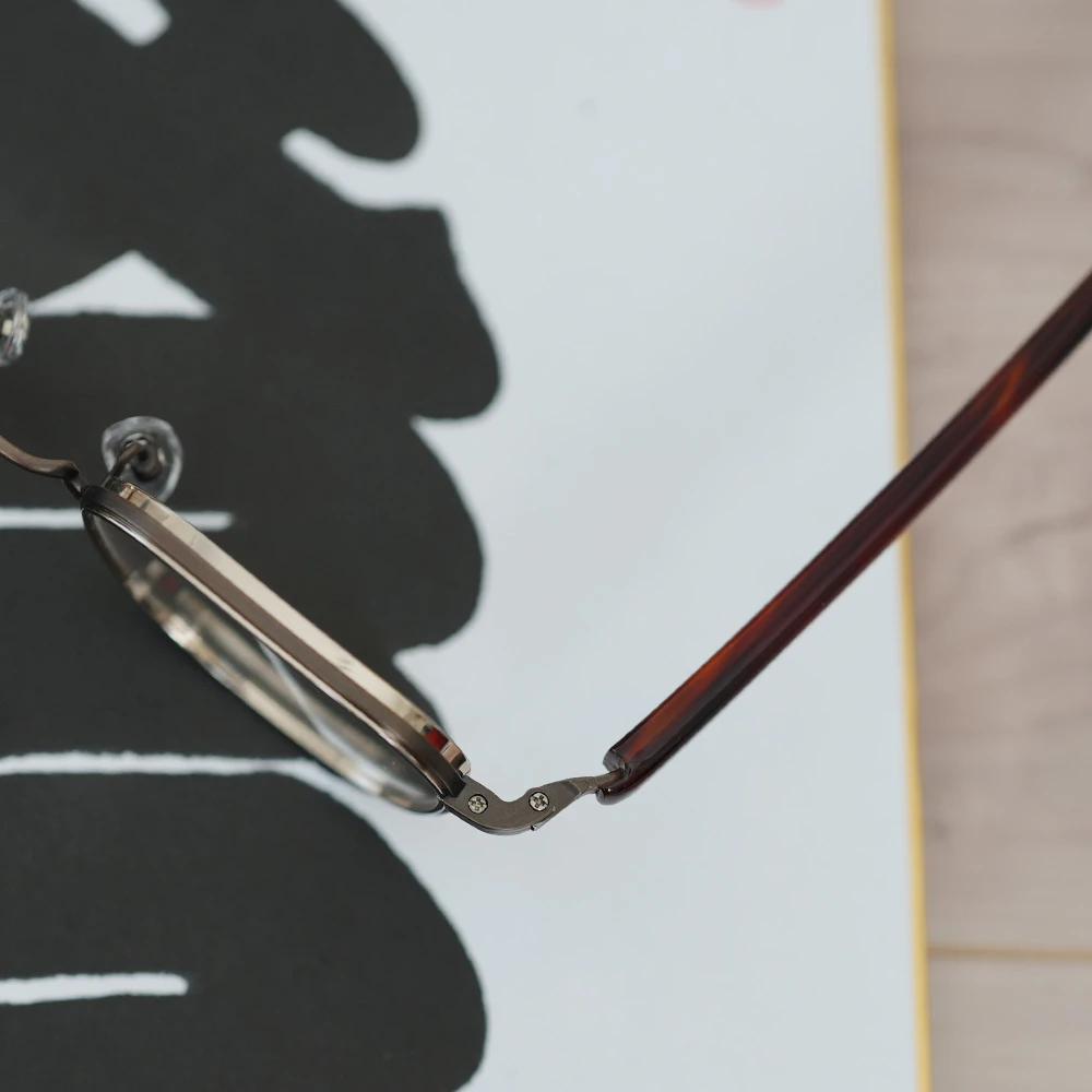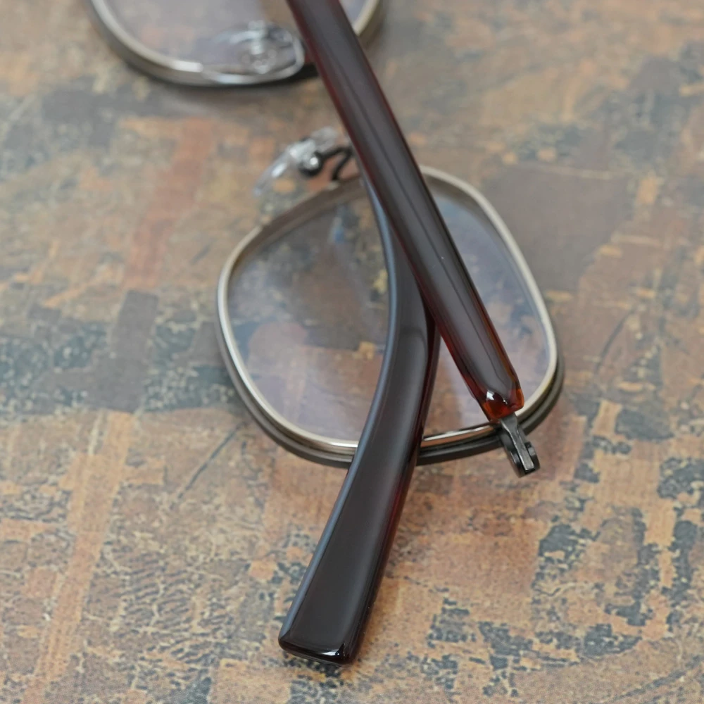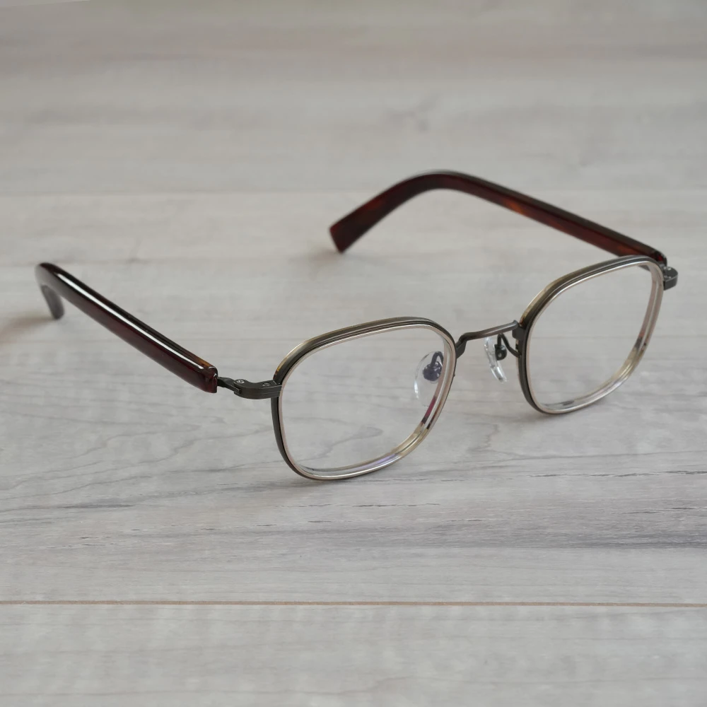 日本で最高峰のチタン加工技術を持つ工場で作製されたダブルチタン構造のスクエアシェイプのフロントとべっ甲(並トロ甲)素材のテンプルを組み合わせたコンビネーションフレーム。クラシックなフロントシェイプですが、マットブラウンとシルバーの内リムを組み合わせた最先端でモダンな構造。べっ甲ならではの落ち着いた上質感と掛け心地の良さは両立した特別なメガネです。べっ甲部分には汗などによる劣化を防ぐコーティング(ベッコート)が施されています。