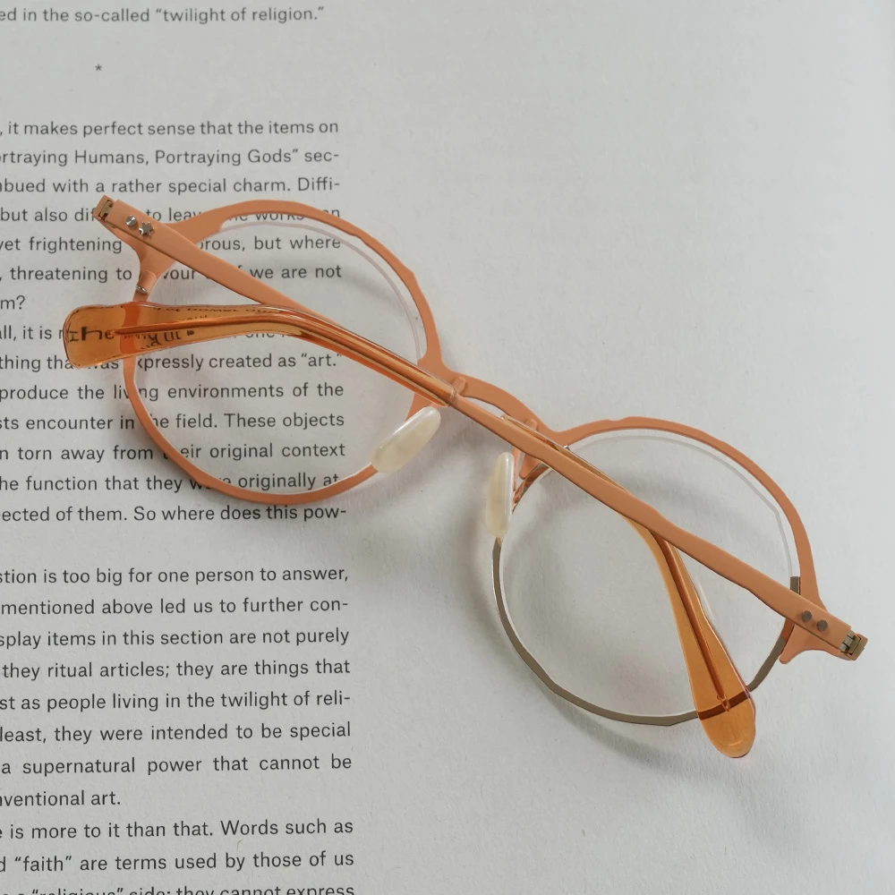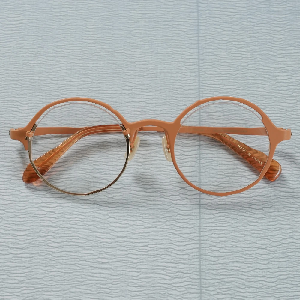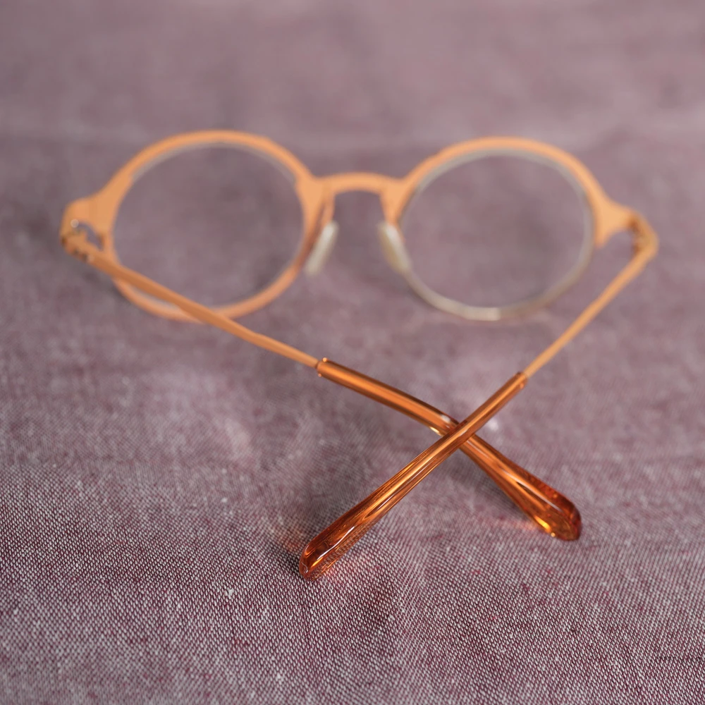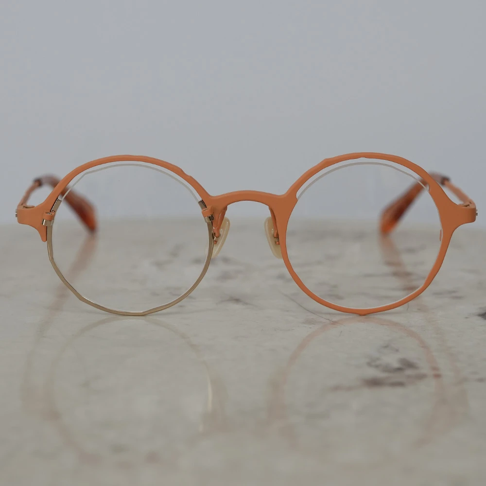 コンセプト「Monocle」、19世紀末にヨーロッパの上流階級の間で流行したという片眼鏡(モノクル)。どこかの美術館で見た、近世の人々の情動を描いた洋画。モノクルから着想したという単純な発想ではなく、額縁の中から溢れでる不思議な気品、その時代の空気感までも再解釈し、現代のデザインに昇華させたラウンドフレーム。右側のゴールドパーツはもちろん、レンズの上に開いた空間もアクセントとなっています。チタン素材を使用しており軽量、日本のチタン加工技術の高さ、職人の心意気を体感できるデザインです。