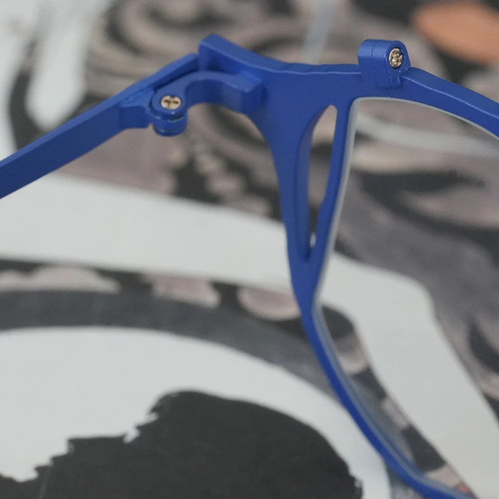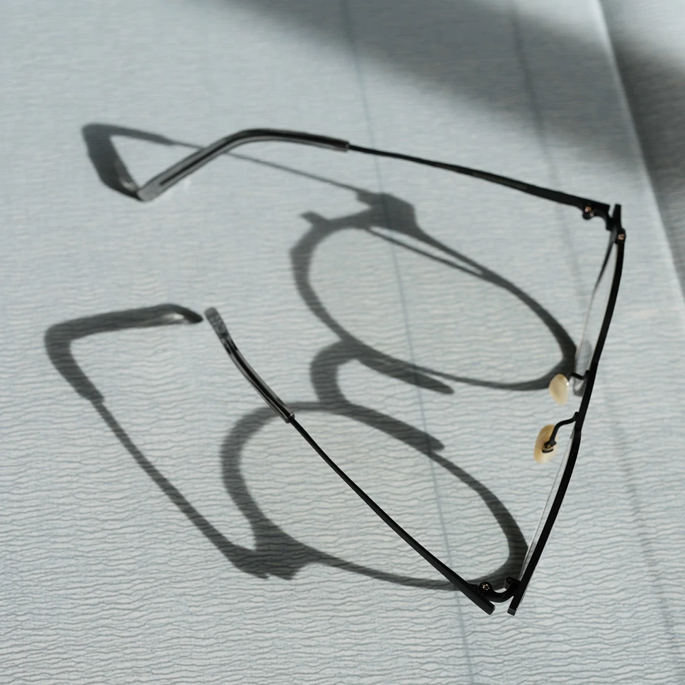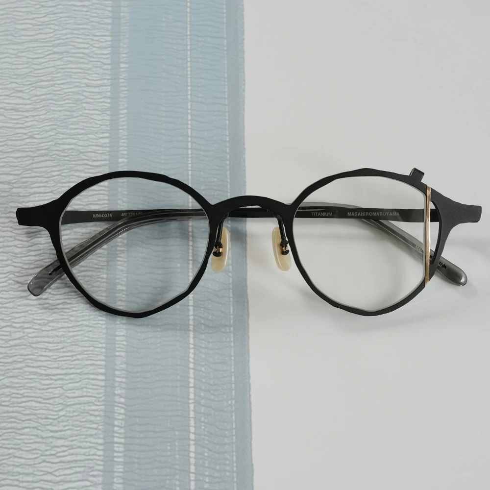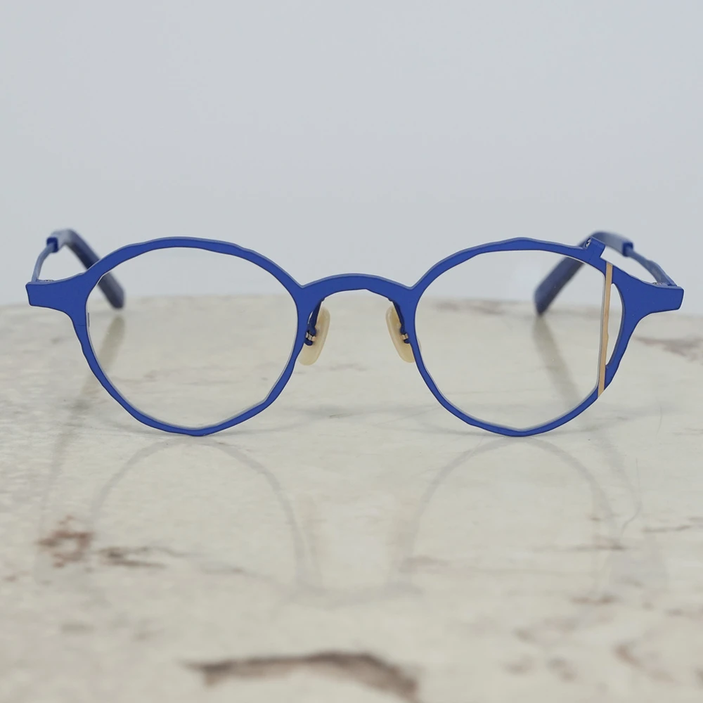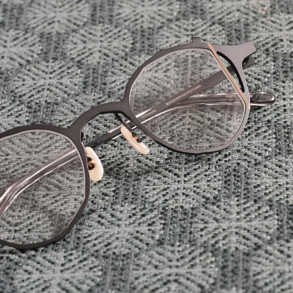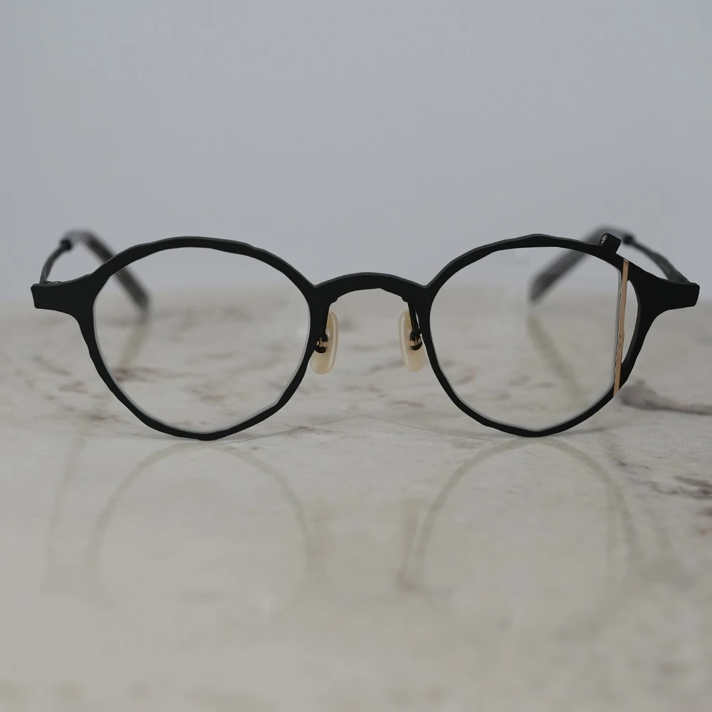 お顔馴染みの良いシャープなレンズシェイプ、左レンズの縦の金のラインが見る人に驚きを与え、着用している方の表情を魅力的に演出します。チタン素材を使用しており軽量、日本のチタン加工技術の高さ、職人の心意気を体感できるデザインです。