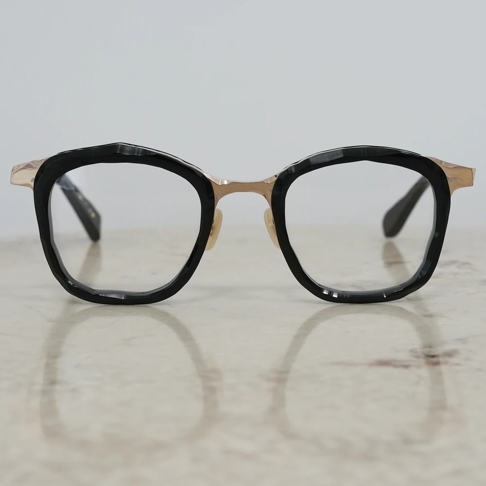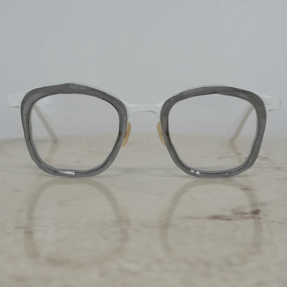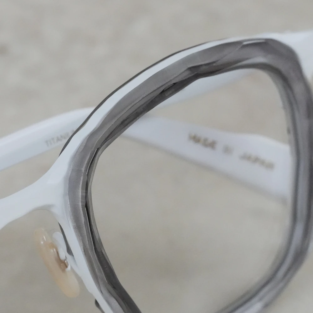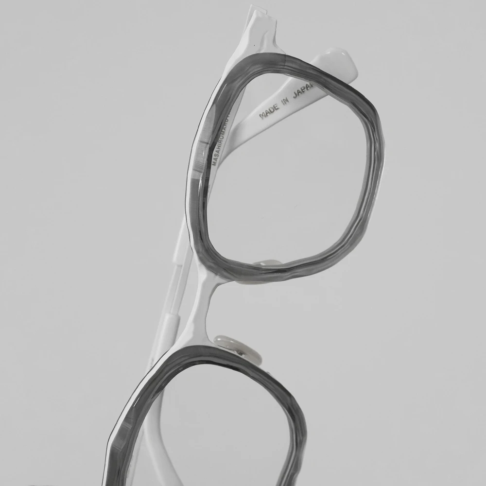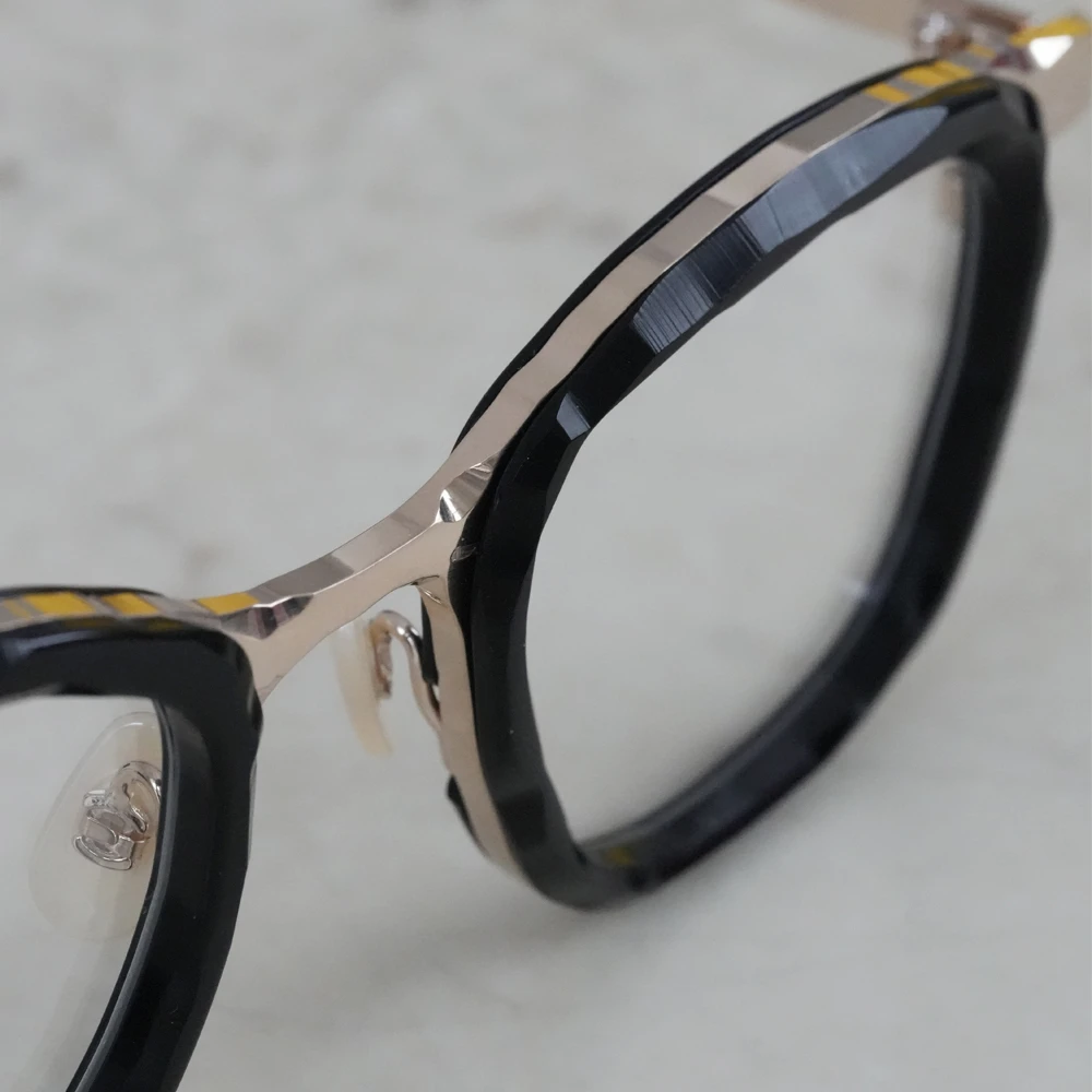 「MM-0105」のアセテートリム付きバージョンは荒々しい素材感がより際立ちます。左右非対称の縦幅の大きいスクエアシェイプ、チタン素材で軽量、掛け心地の良さも魅力的です。コンセプト「Sculpt」、制作過程の中にある美しさを表現したメガネフレームは多くありますが、メタル素材での表現が非常に斬新。ノミと木槌で粗く削ぎ落とした跡、重ねられた土塊の隙間にできる空間、制作のために組まれた骨組みなど彫刻が創られる風景の中にある様々な要素から練り上げられたクールなコレクション。