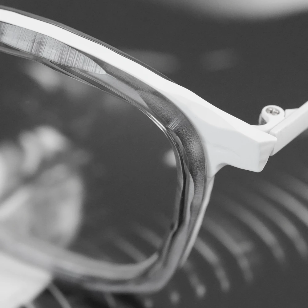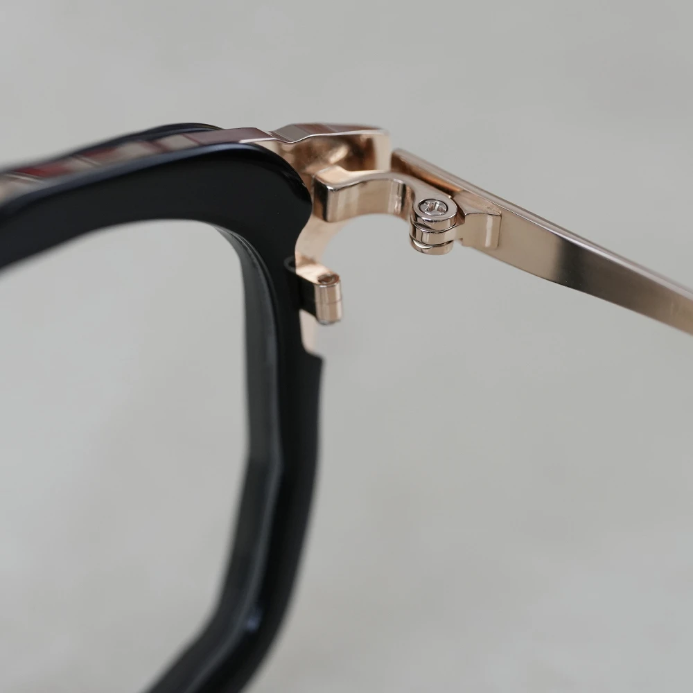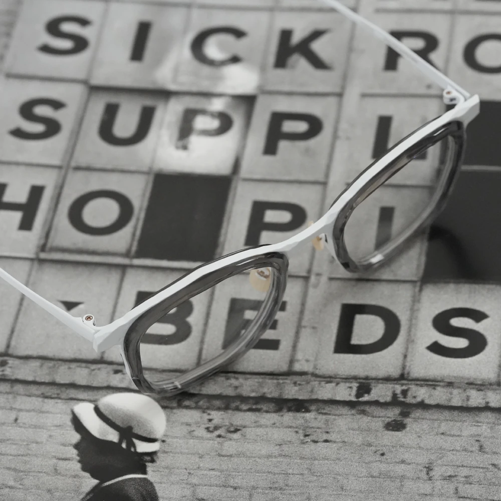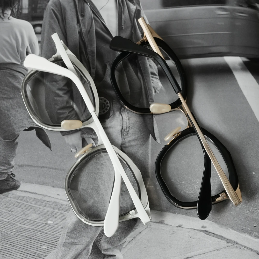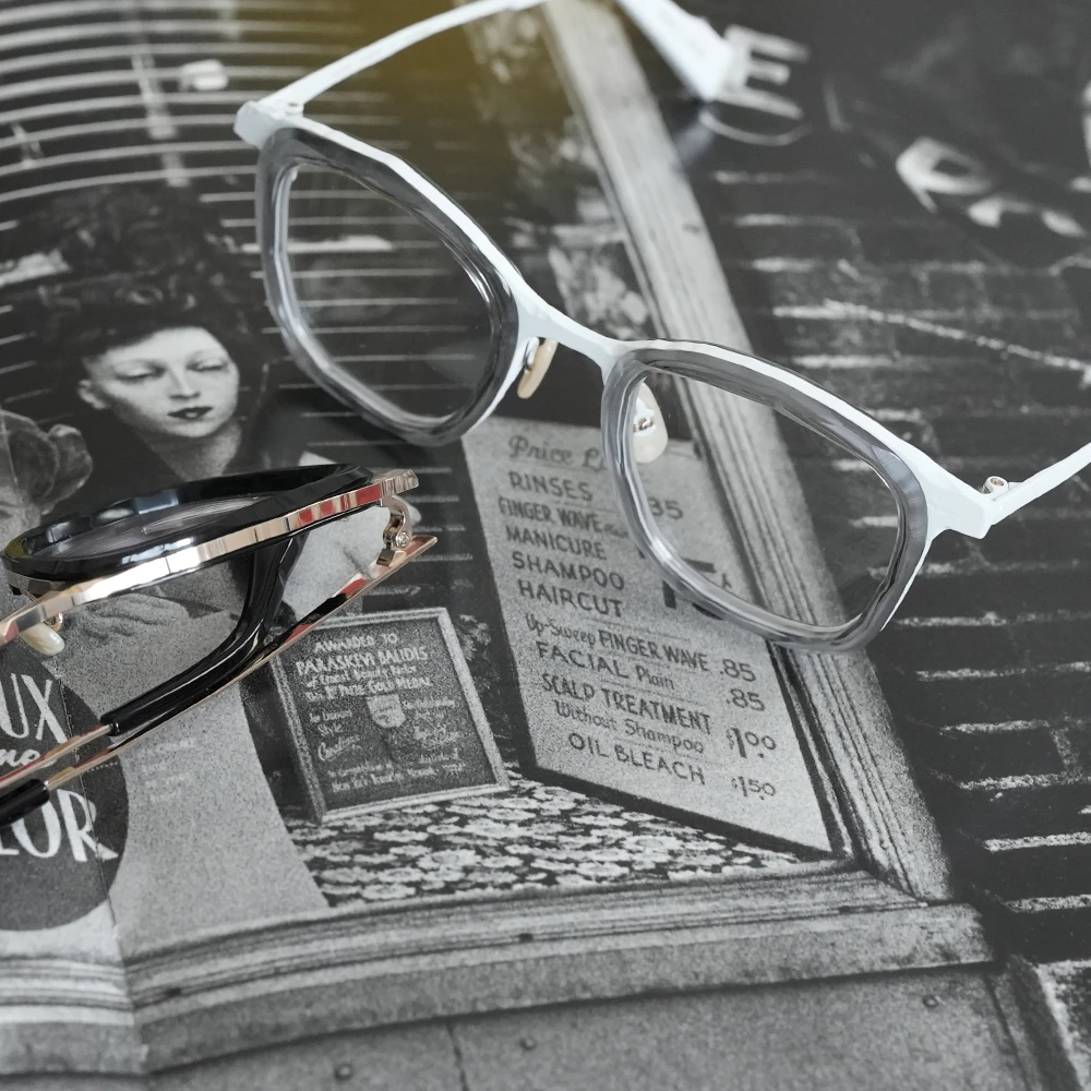 「MM-0105」のアセテートリム付きバージョンは荒々しい素材感がより際立ちます。左右非対称の縦幅の大きいスクエアシェイプ、チタン素材で軽量、掛け心地の良さも魅力的です。コンセプト「Sculpt」、制作過程の中にある美しさを表現したメガネフレームは多くありますが、メタル素材での表現が非常に斬新。ノミと木槌で粗く削ぎ落とした跡、重ねられた土塊の隙間にできる空間、制作のために組まれた骨組みなど彫刻が創られる風景の中にある様々な要素から練り上げられたクールなコレクション。