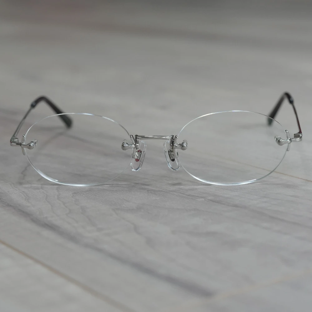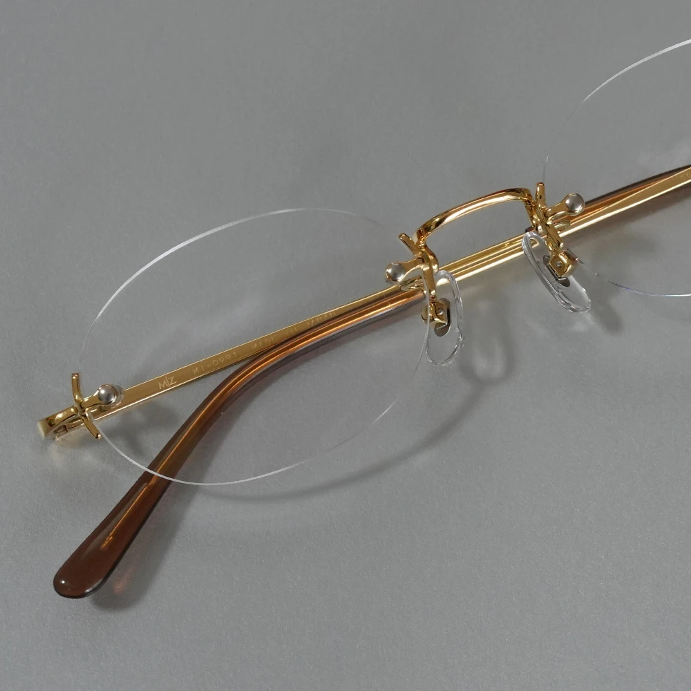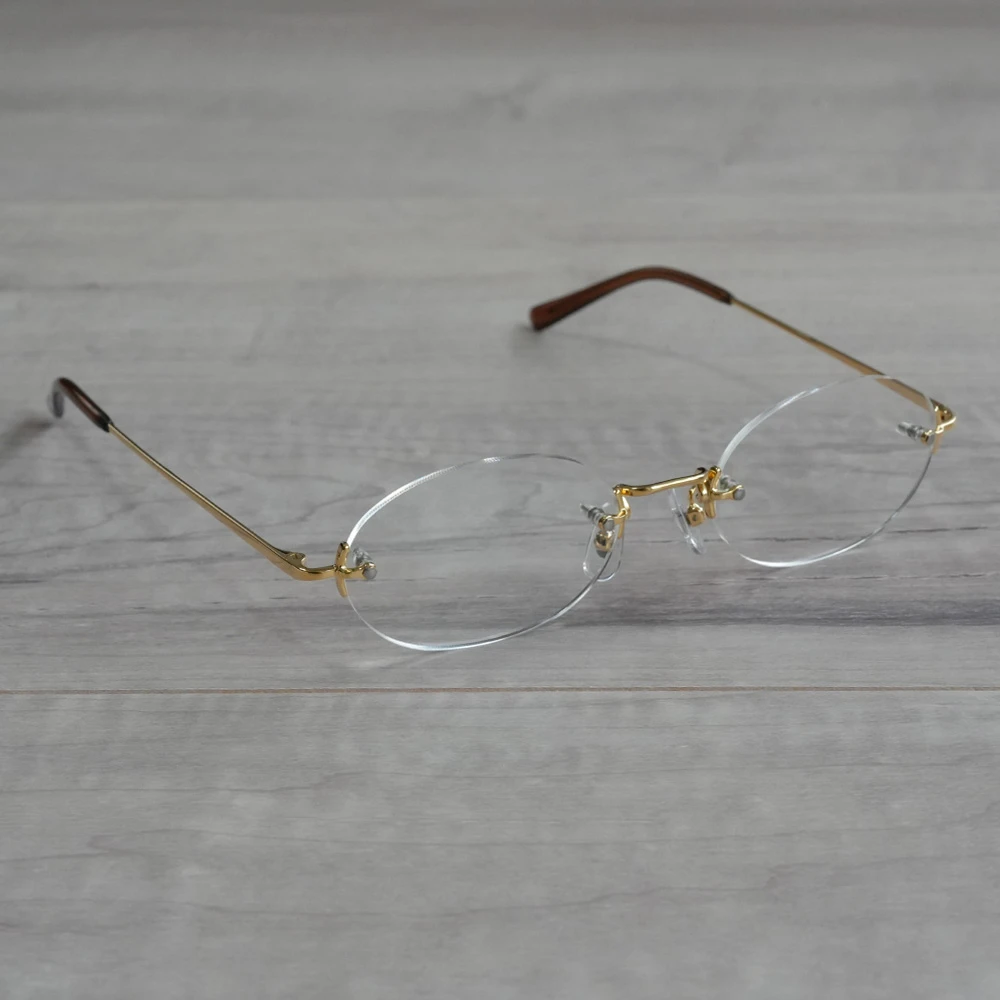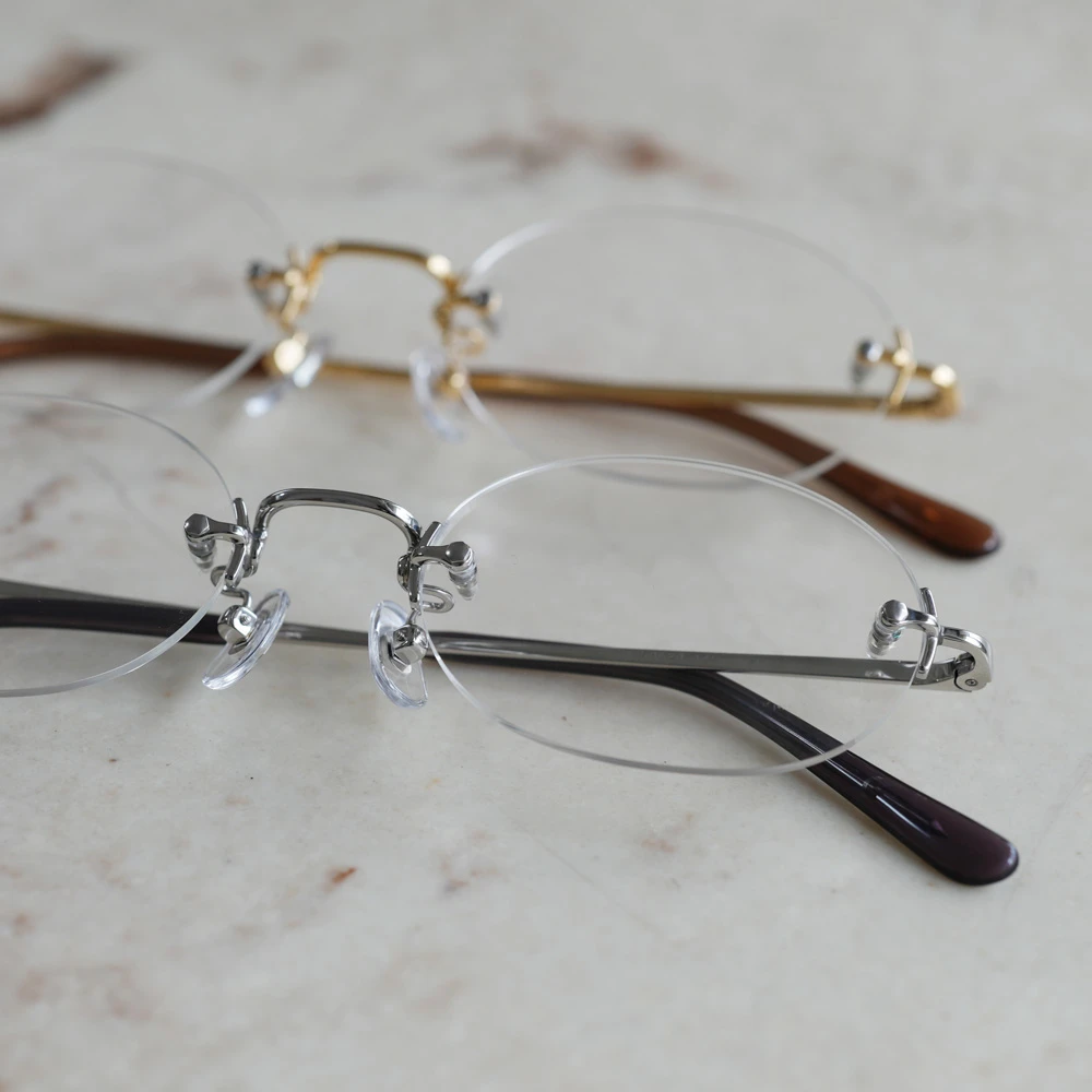 オーセンティックなオーバールシェイプのリムレスフレーム(縁なしメガネ)は性別問わずお勧めです。レンズのサイズはお顔のサイズに合わせて変更することも可能です。