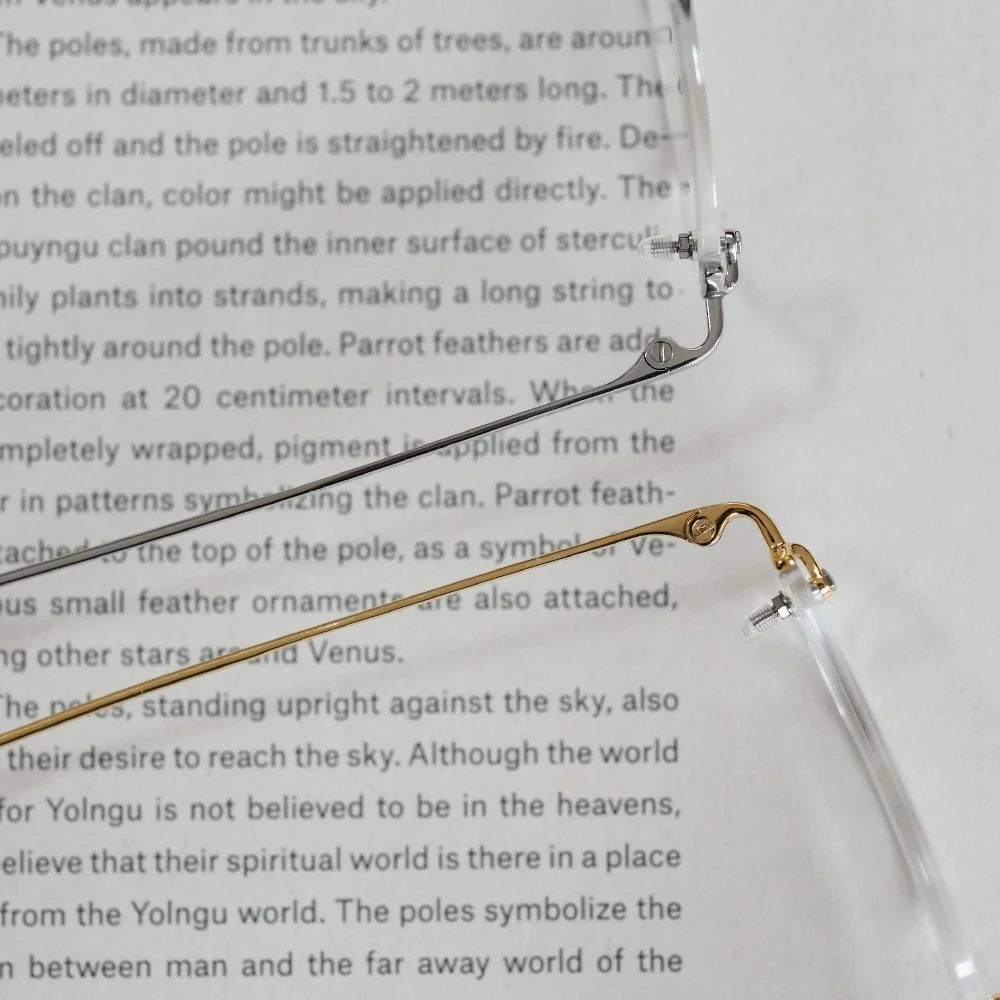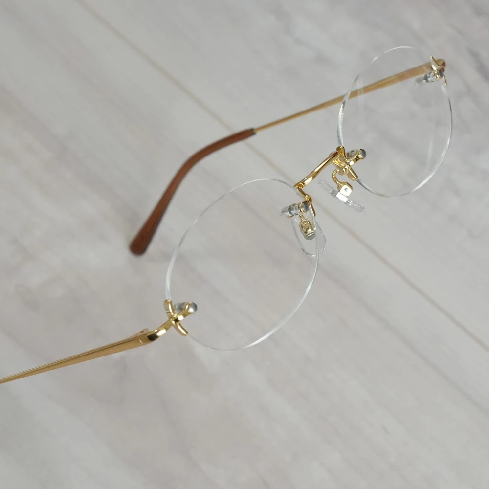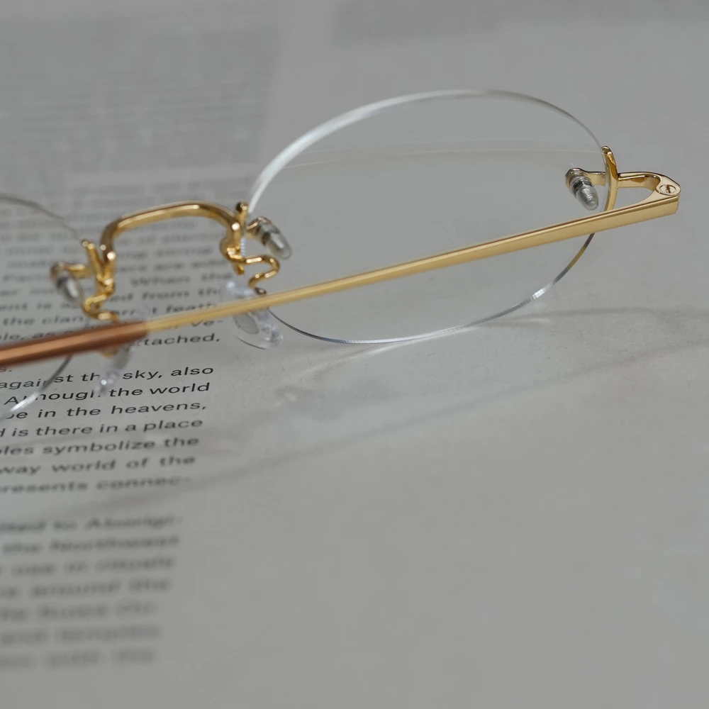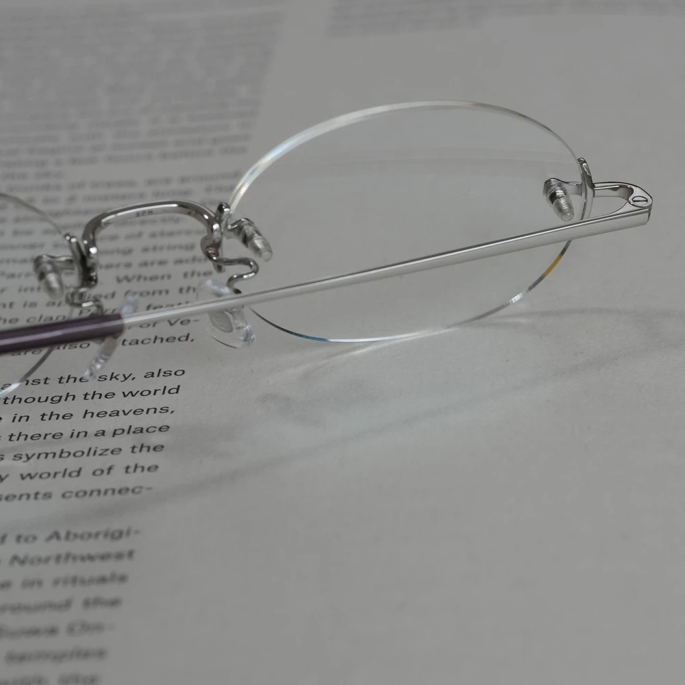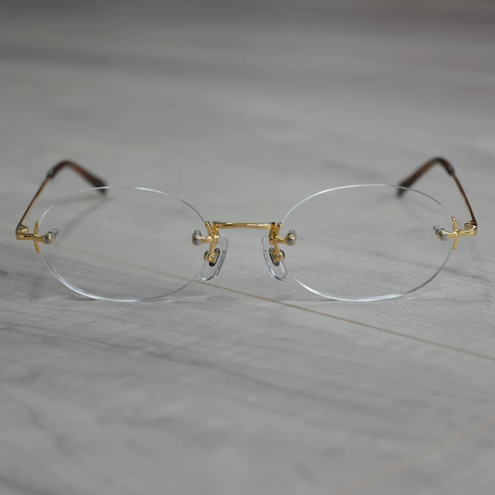 オーセンティックなオーバールシェイプのリムレスフレーム(縁なしメガネ)は性別問わずお勧めです。レンズのサイズはお顔のサイズに合わせて変更することも可能です。