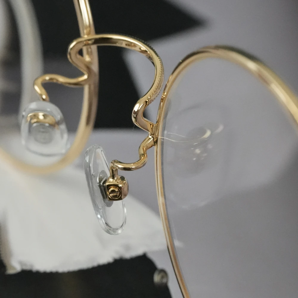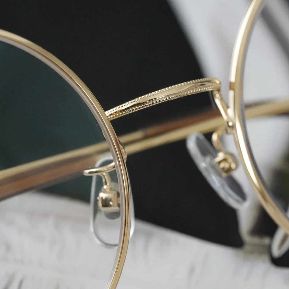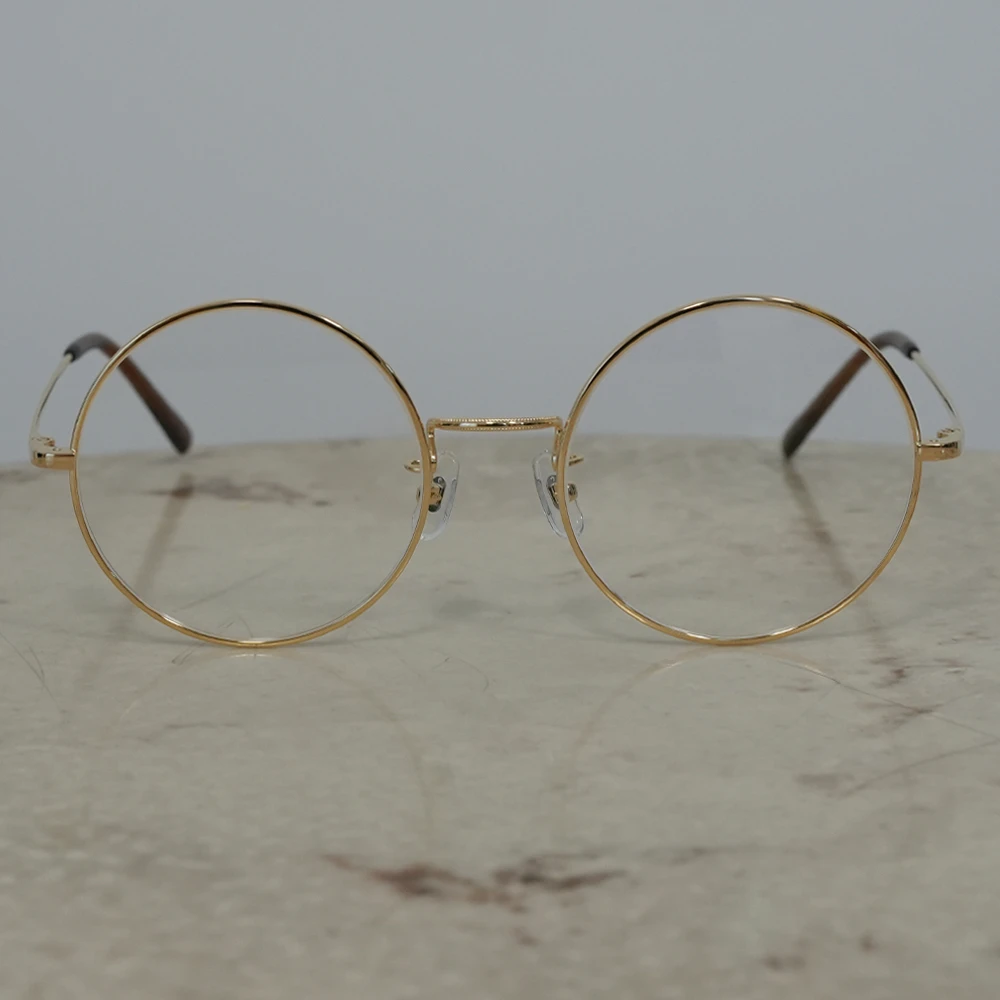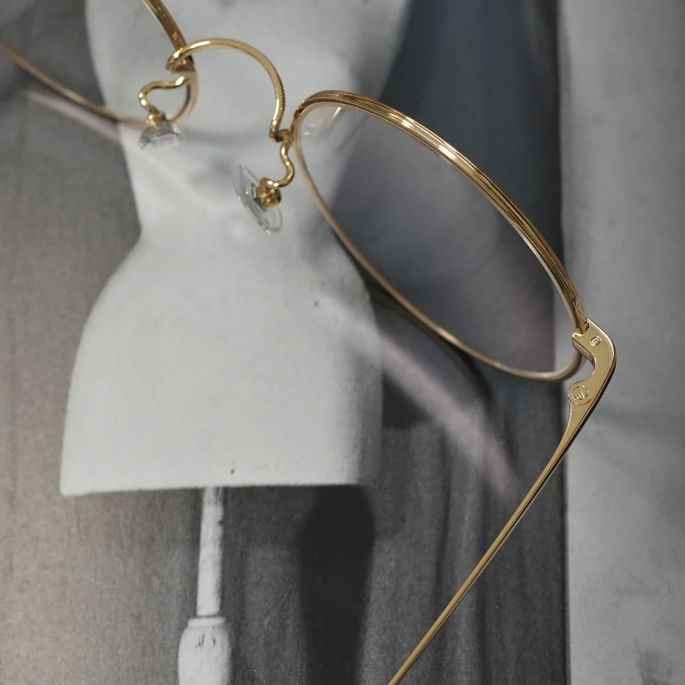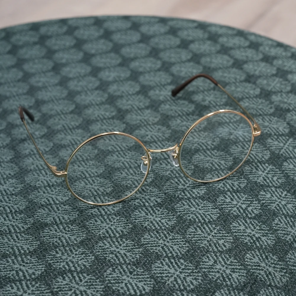 ミツメドウで特別オーダーしたビッグサイズのラウンドフレーム。金メッキを施したサンプラチナの輝きが美しくラグジュアリーな雰囲気。安定感のある掛け心地の良さも魅力です。