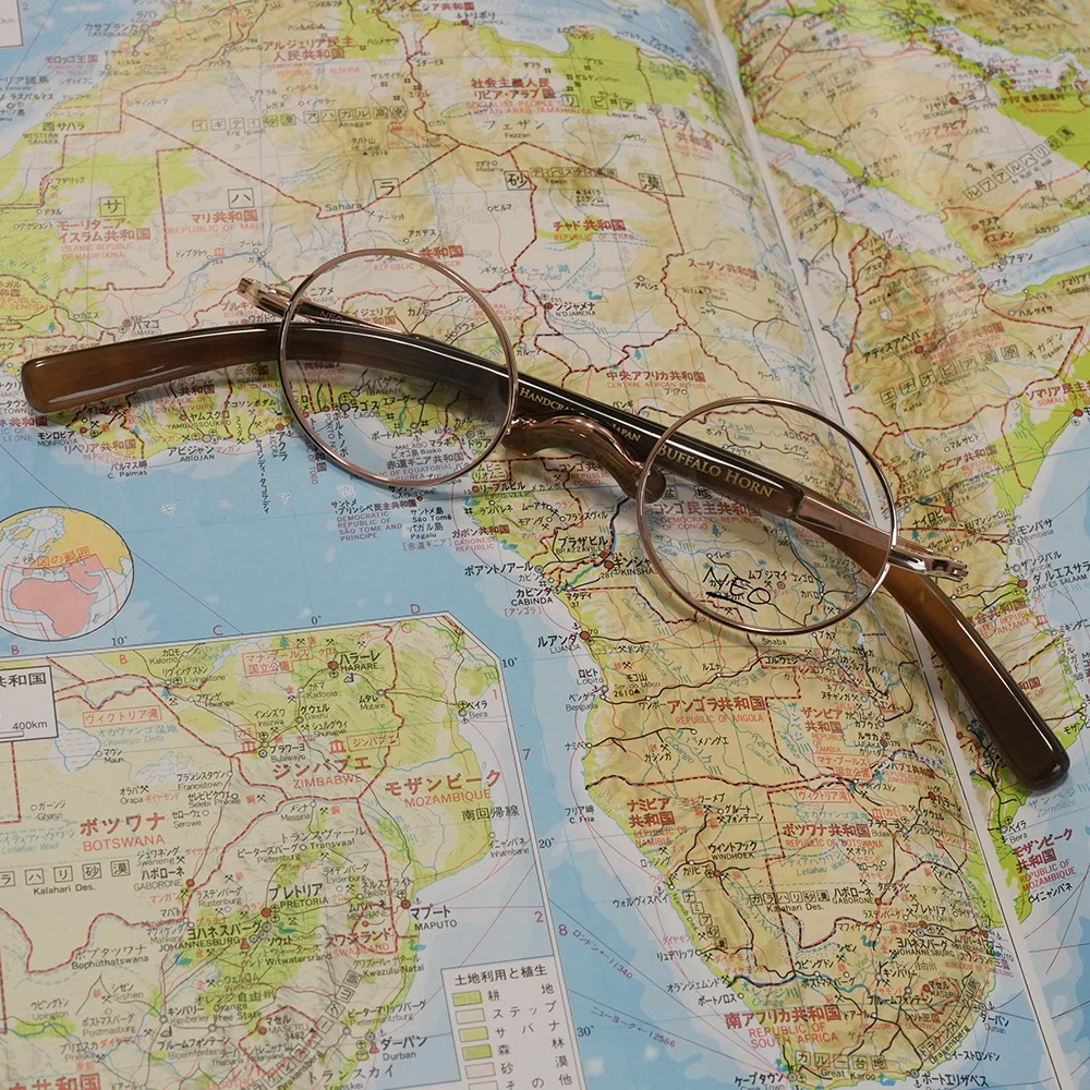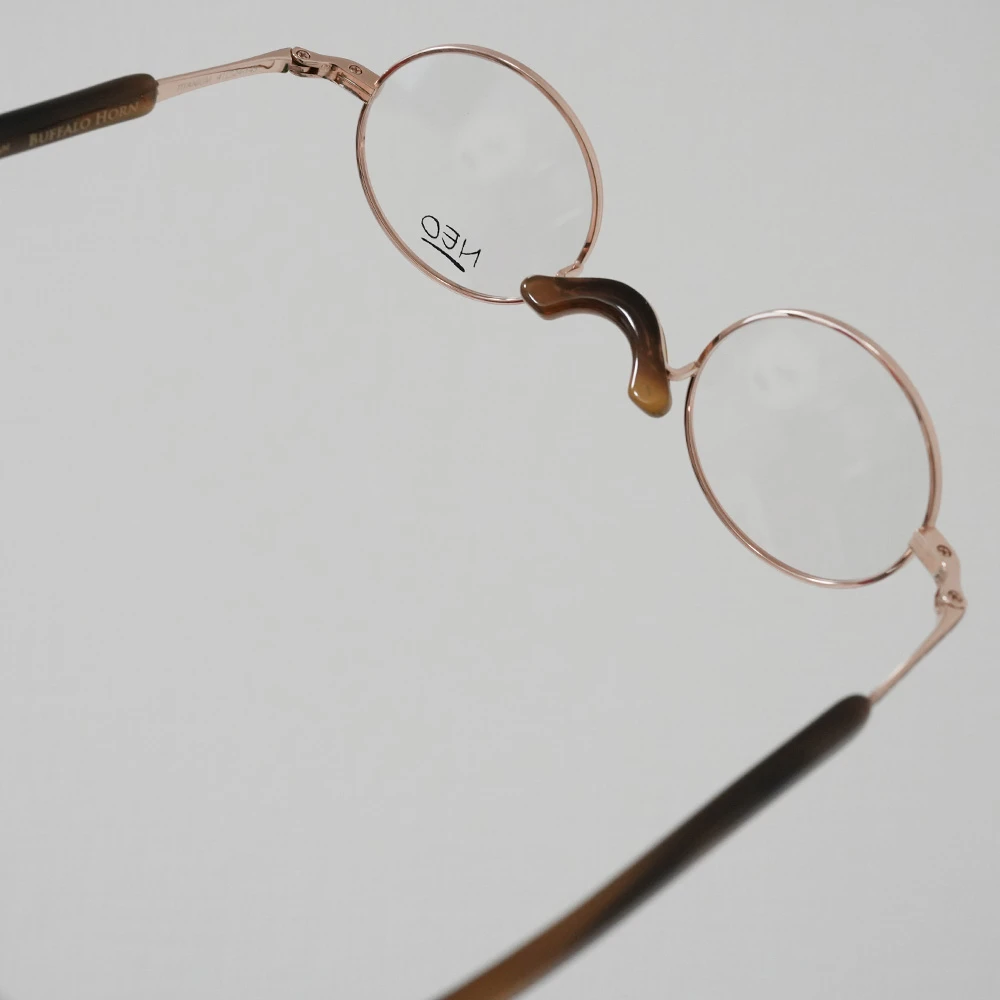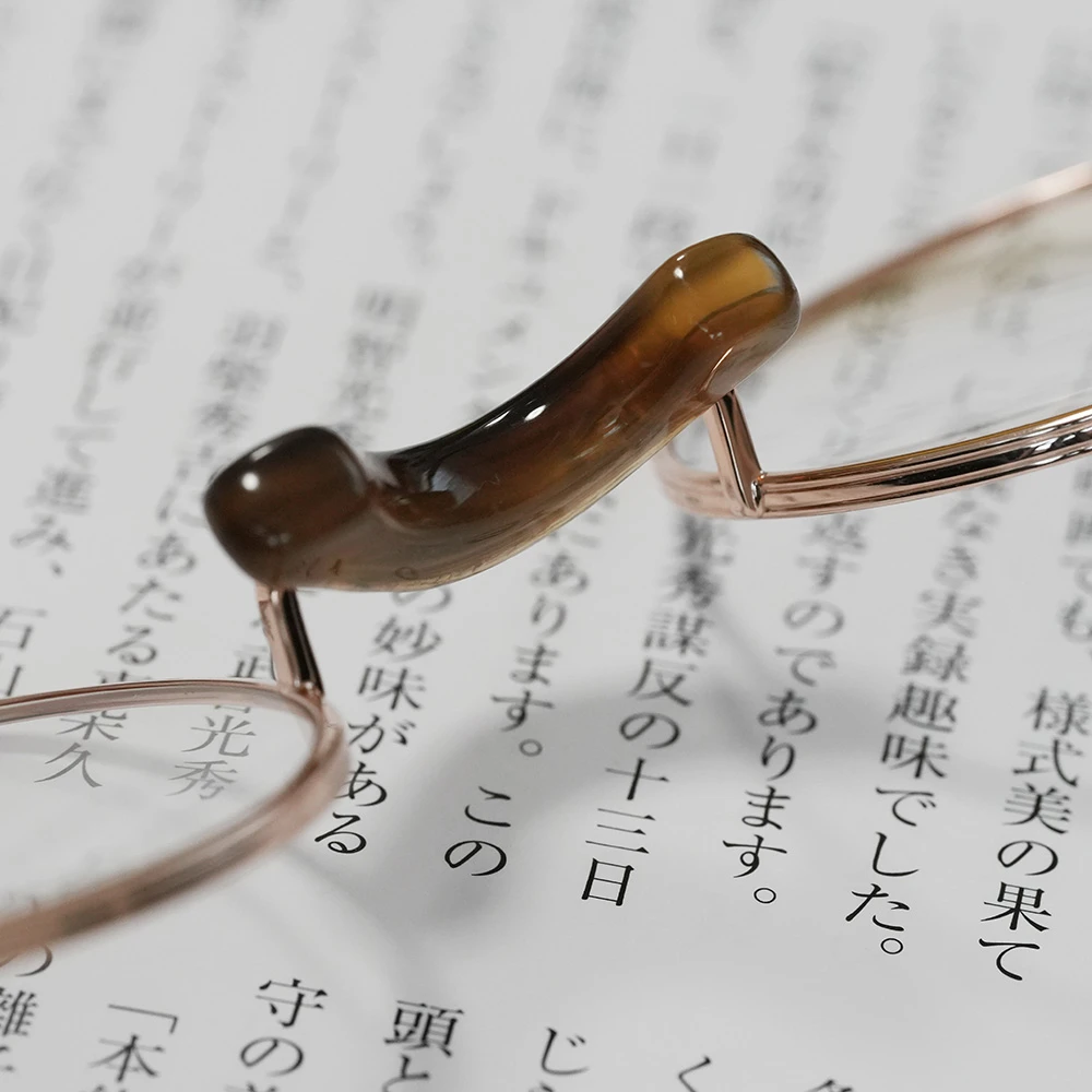 一山(サドルブリッジ)仕様のクラシックなオーバルシェイプ、金属部分はチタン、そしてテンプル、鼻パッドという肌に触れる部分には肌馴染みが非常に良く、アレルギーも起こらない高級天然素材、バッファローホーン(インド産 or アフリカ産)を使用しています。
