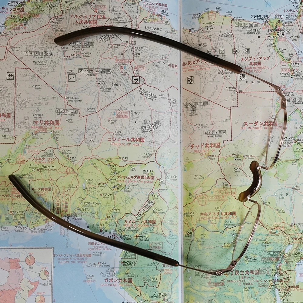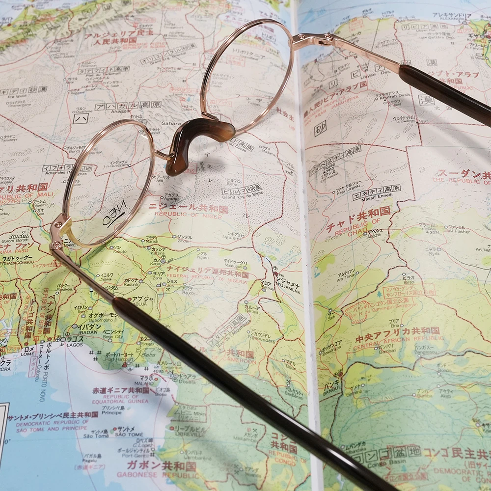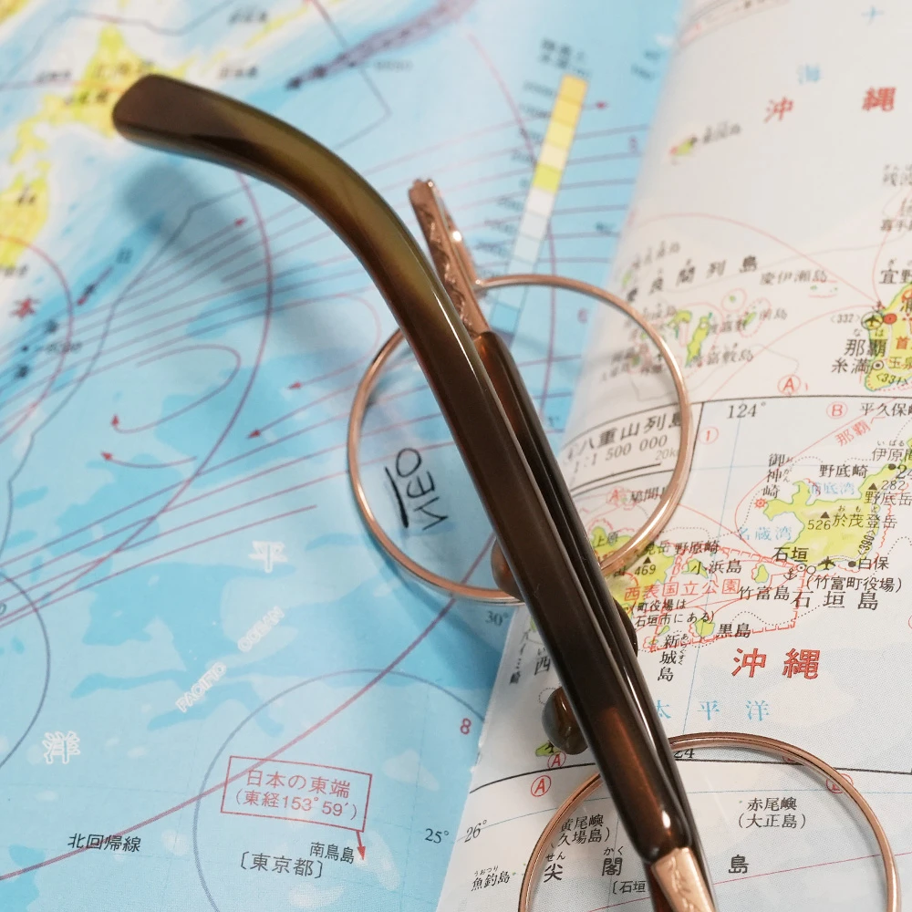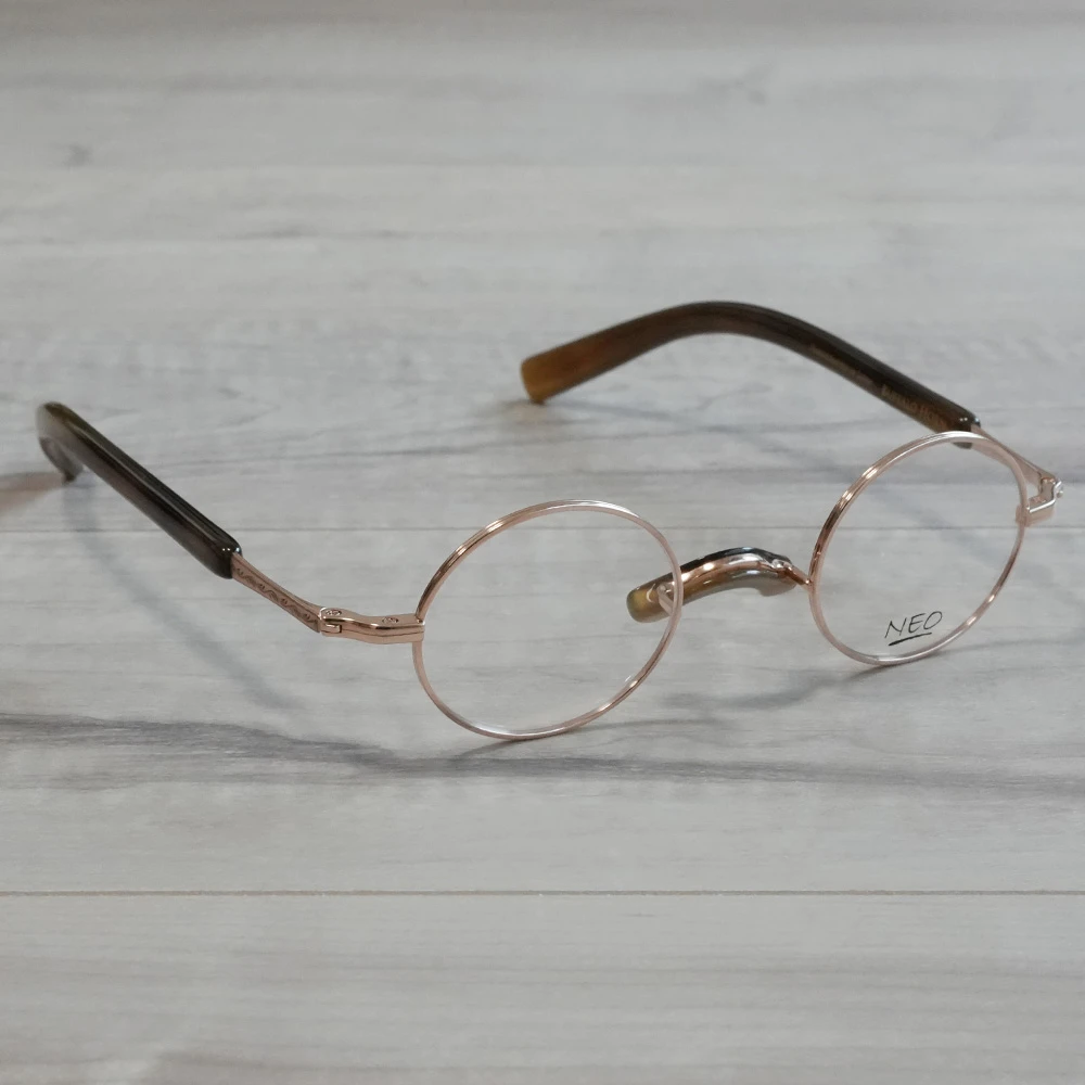 一山(サドルブリッジ)仕様のクラシックなオーバルシェイプ、金属部分はチタン、そしてテンプル、鼻パッドという肌に触れる部分には肌馴染みが非常に良く、アレルギーも起こらない高級天然素材、バッファローホーン(インド産 or アフリカ産)を使用しています。
