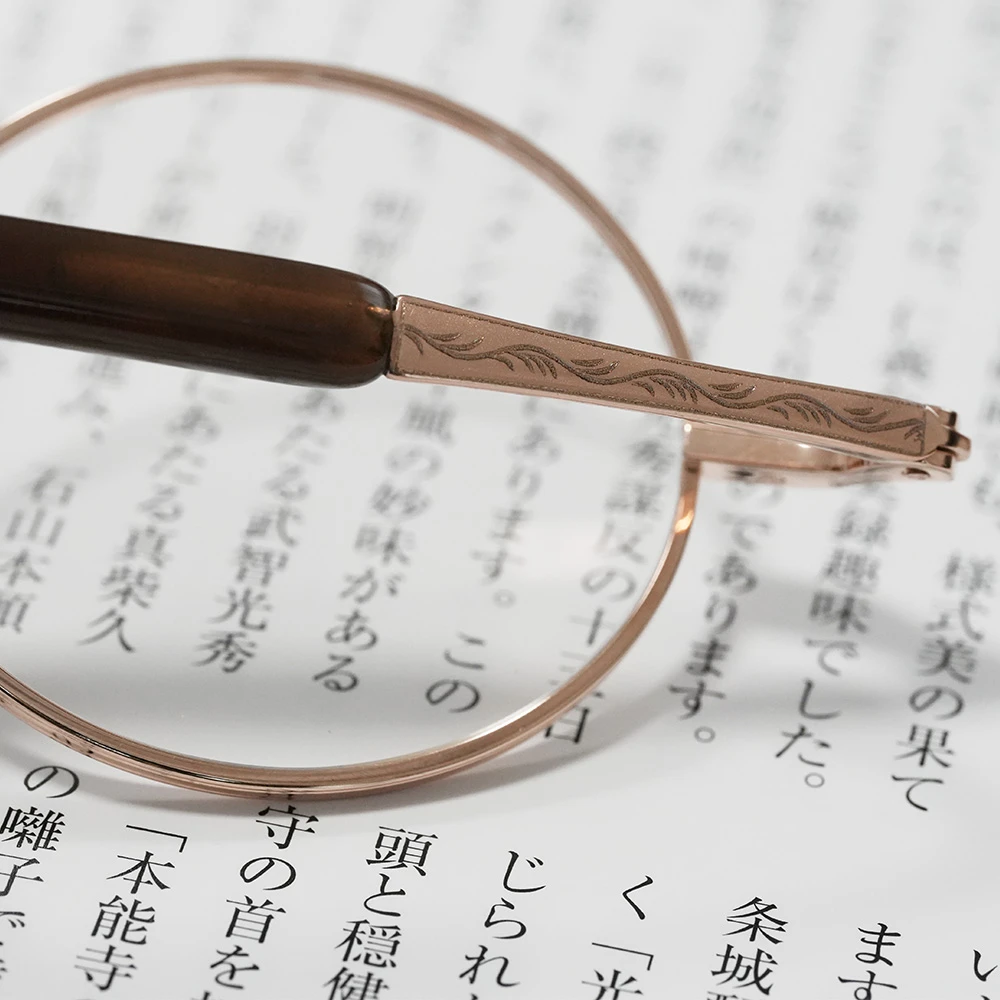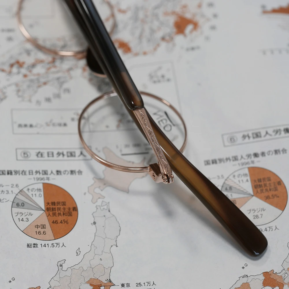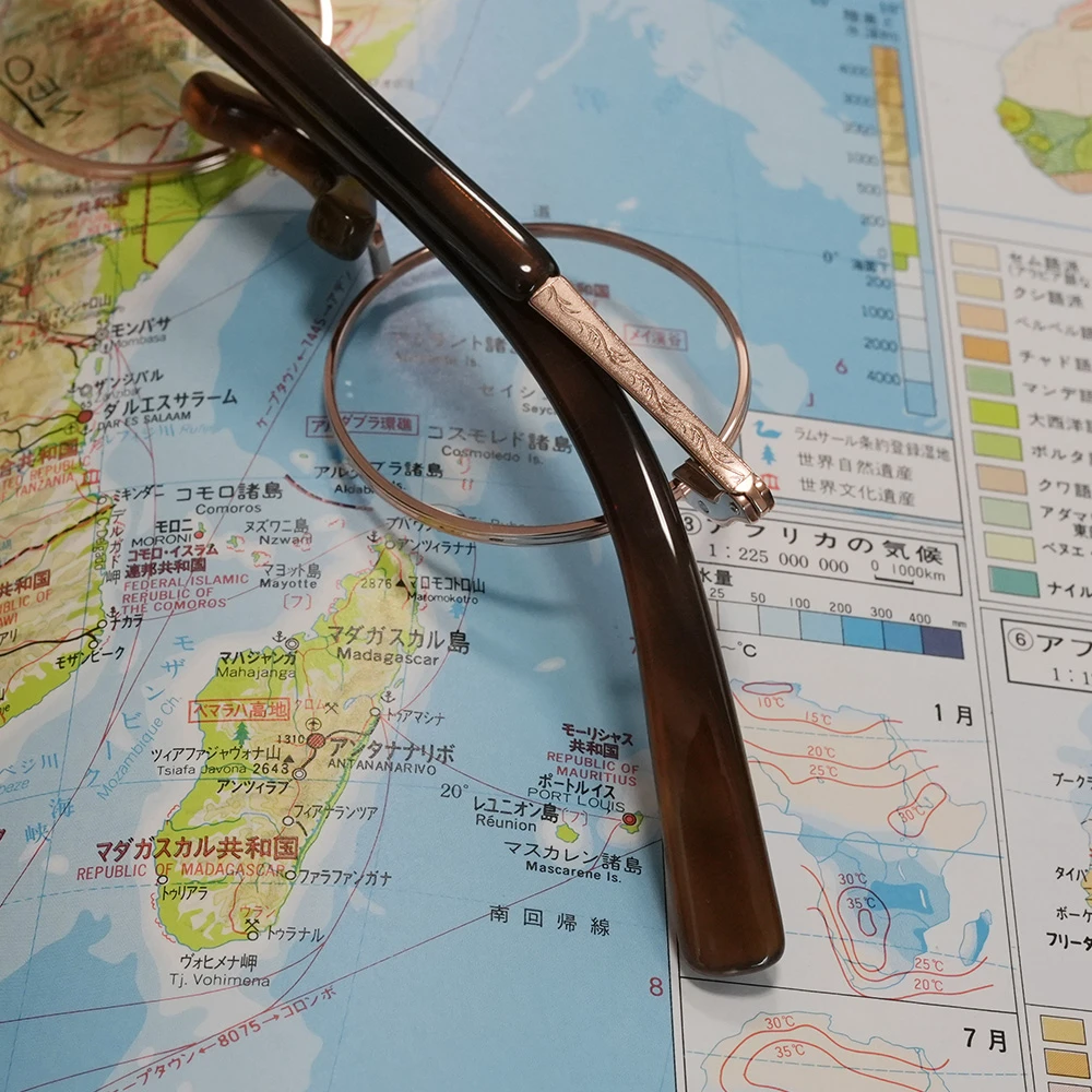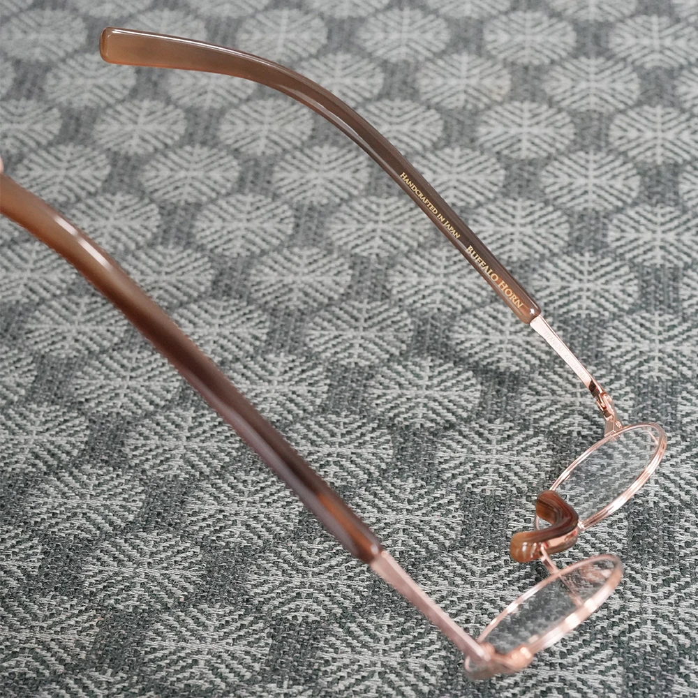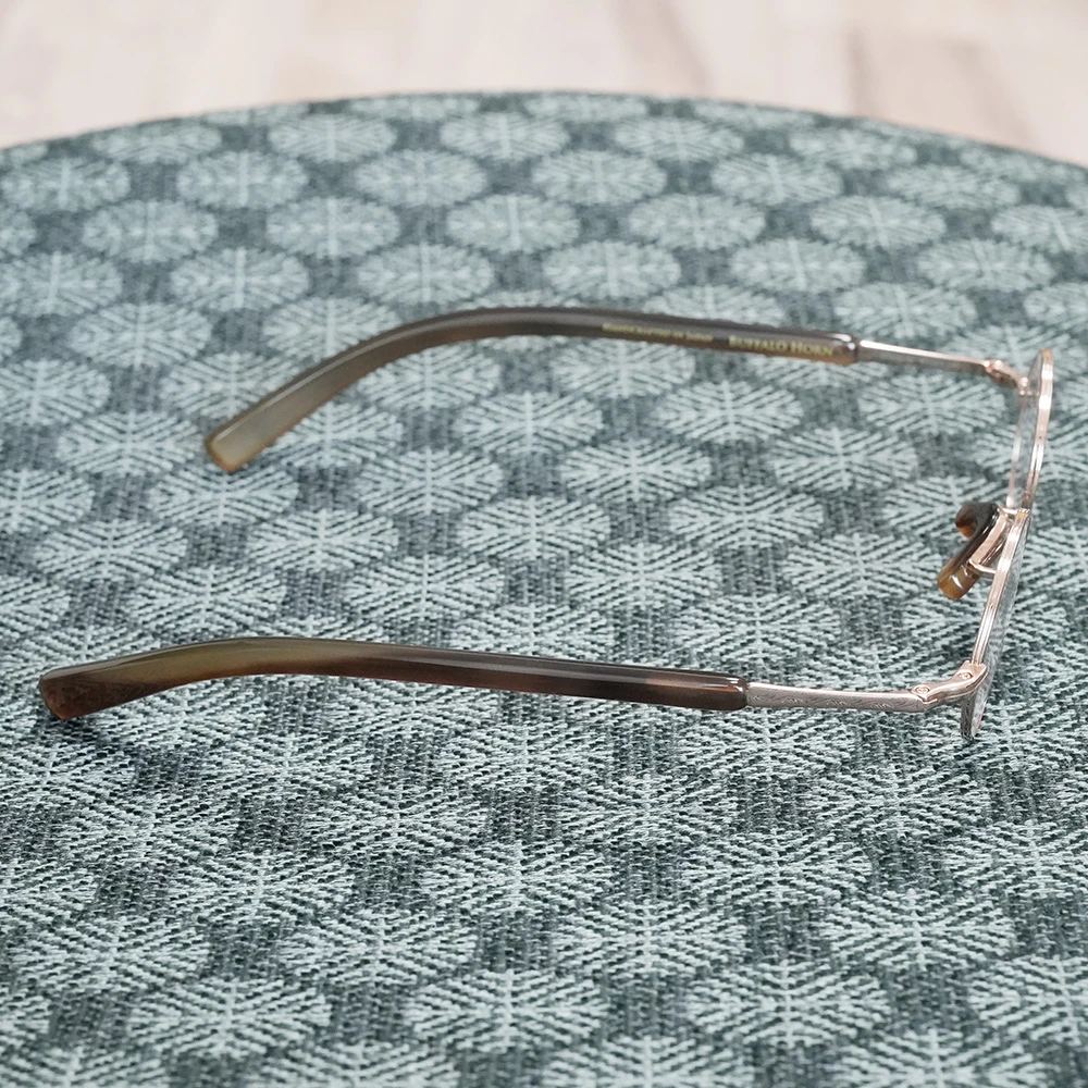 テンプルのチタン部分に施された柔らかい植物柄の刻印がアクセント。バッファローホーンならではのユニークな模様は1つとして同じものはありません。デザインと掛け心地の良さを両立した特別なコンビネーションフレーム。バッファローホーン部分には汗などで劣化しにくようにコーティングが施されています。