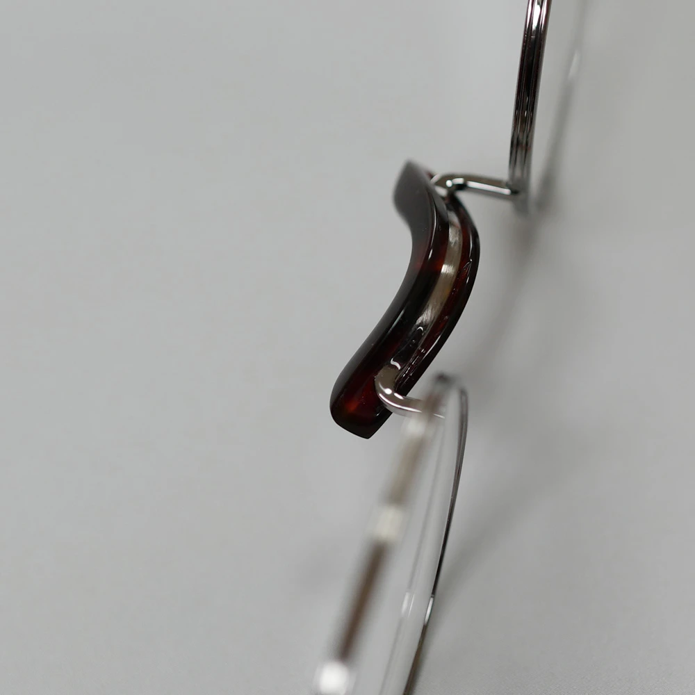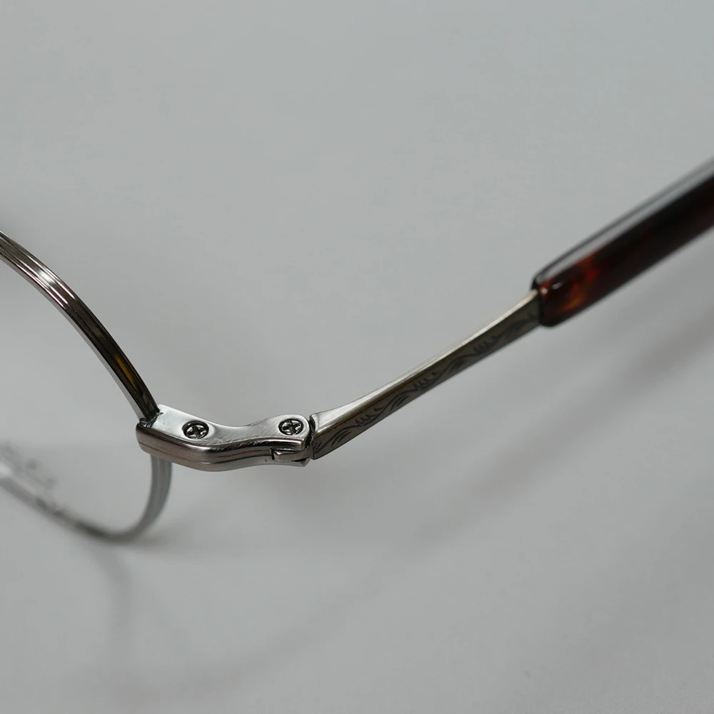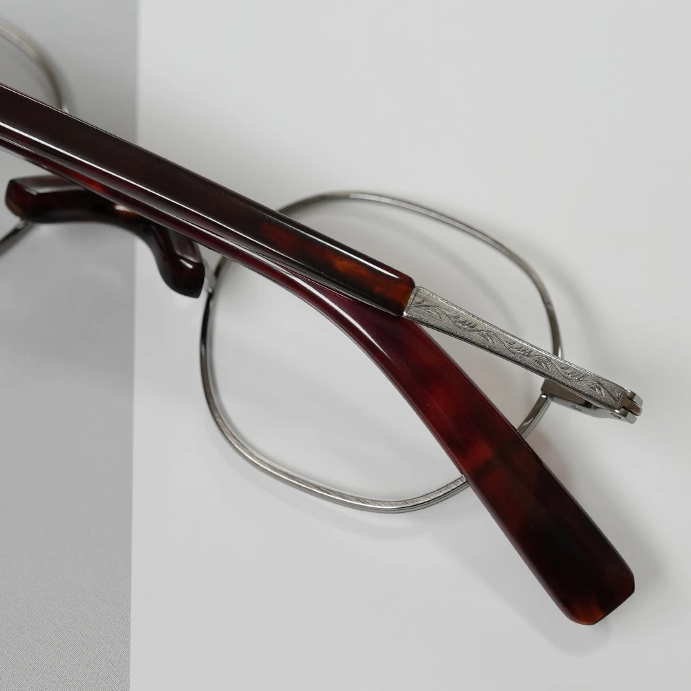 一山(サドルブリッジ)仕様のクラシックなヘキサゴン(六角形)型フレーム、金属部分はチタン、そしてテンプル、鼻パッドという肌に触れる部分には肌馴染みが非常に良く、アレルギーも起こらない高級天然素材、べっ甲(並トロ甲)を使用しています。テンプルのチタン部分に施された柔らかい植物柄の刻印がアクセント。べっ甲ならではの落ち着いた上質感と掛け心地の良さは両立した特別なコンビネーションフレーム。べっ甲部分には汗などで劣化しにくようにコーティングが施されています。