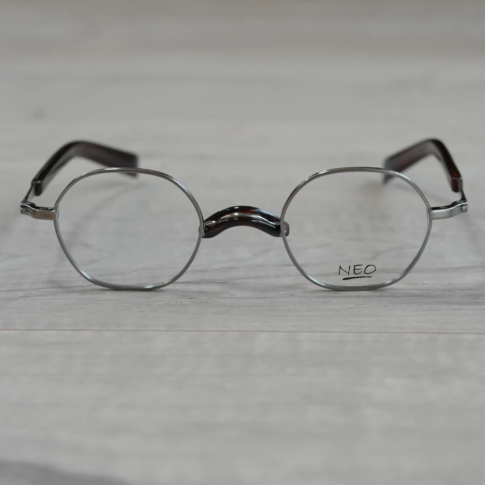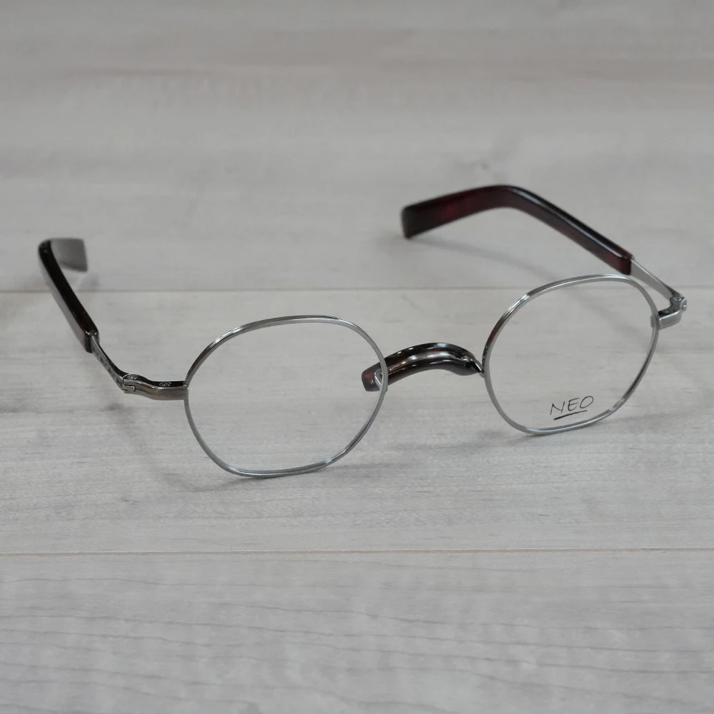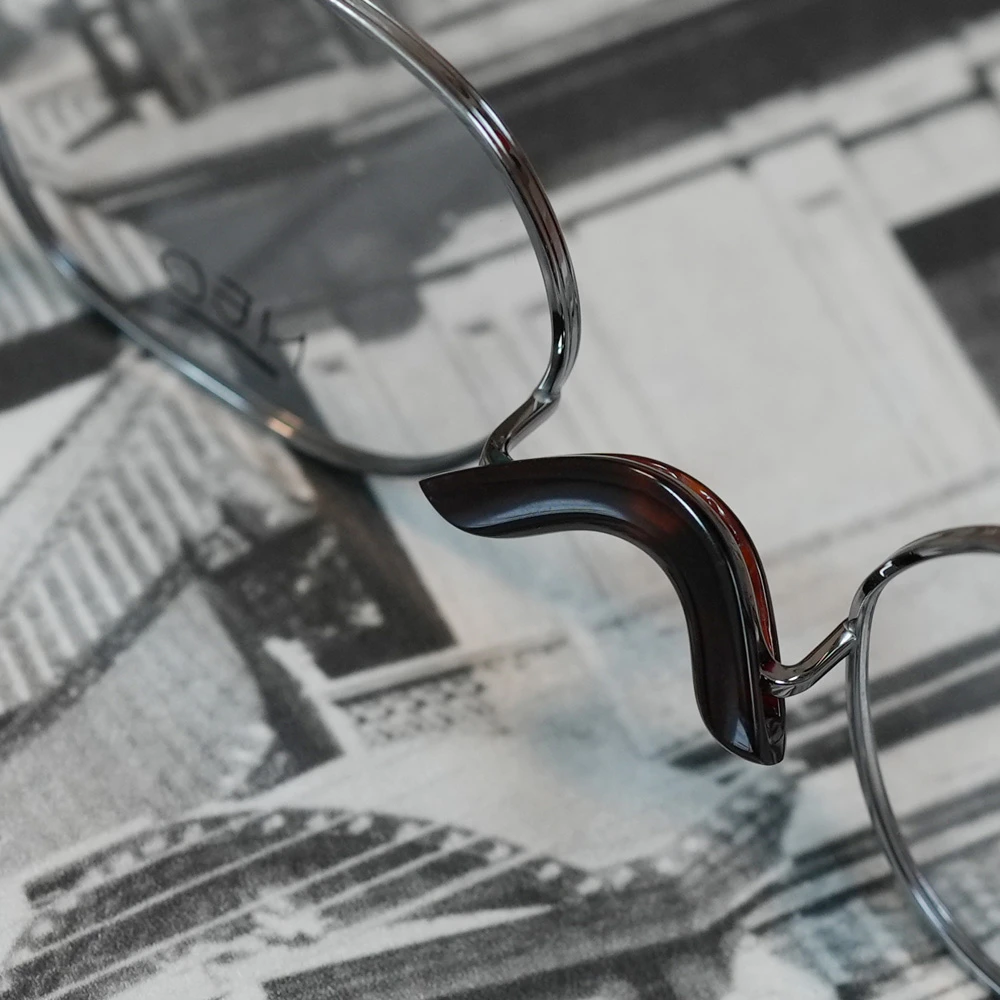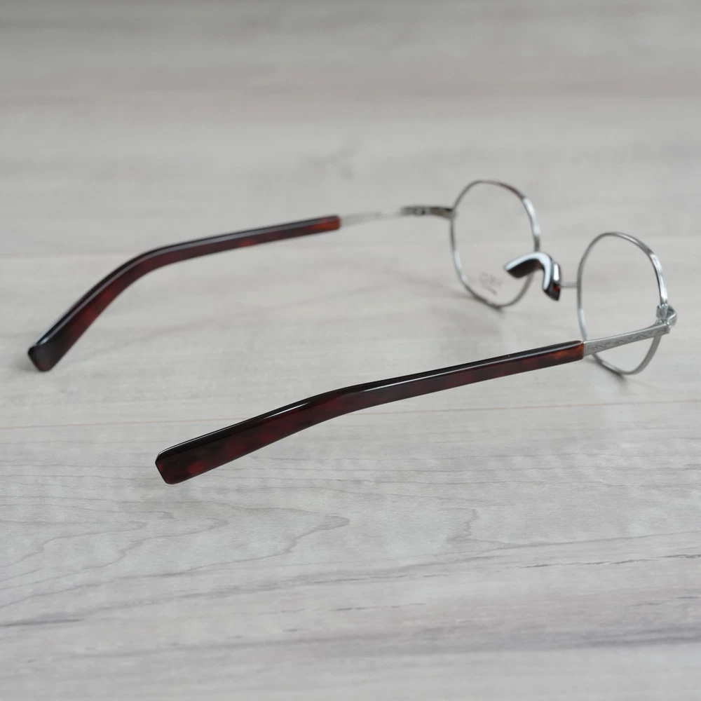 一山(サドルブリッジ)仕様のクラシックなヘキサゴン(六角形)型フレーム、金属部分はチタン、そしてテンプル、鼻パッドという肌に触れる部分には肌馴染みが非常に良く、アレルギーも起こらない高級天然素材、べっ甲(並トロ甲)を使用しています。テンプルのチタン部分に施された柔らかい植物柄の刻印がアクセント。べっ甲ならではの落ち着いた上質感と掛け心地の良さは両立した特別なコンビネーションフレーム。べっ甲部分には汗などで劣化しにくようにコーティングが施されています。