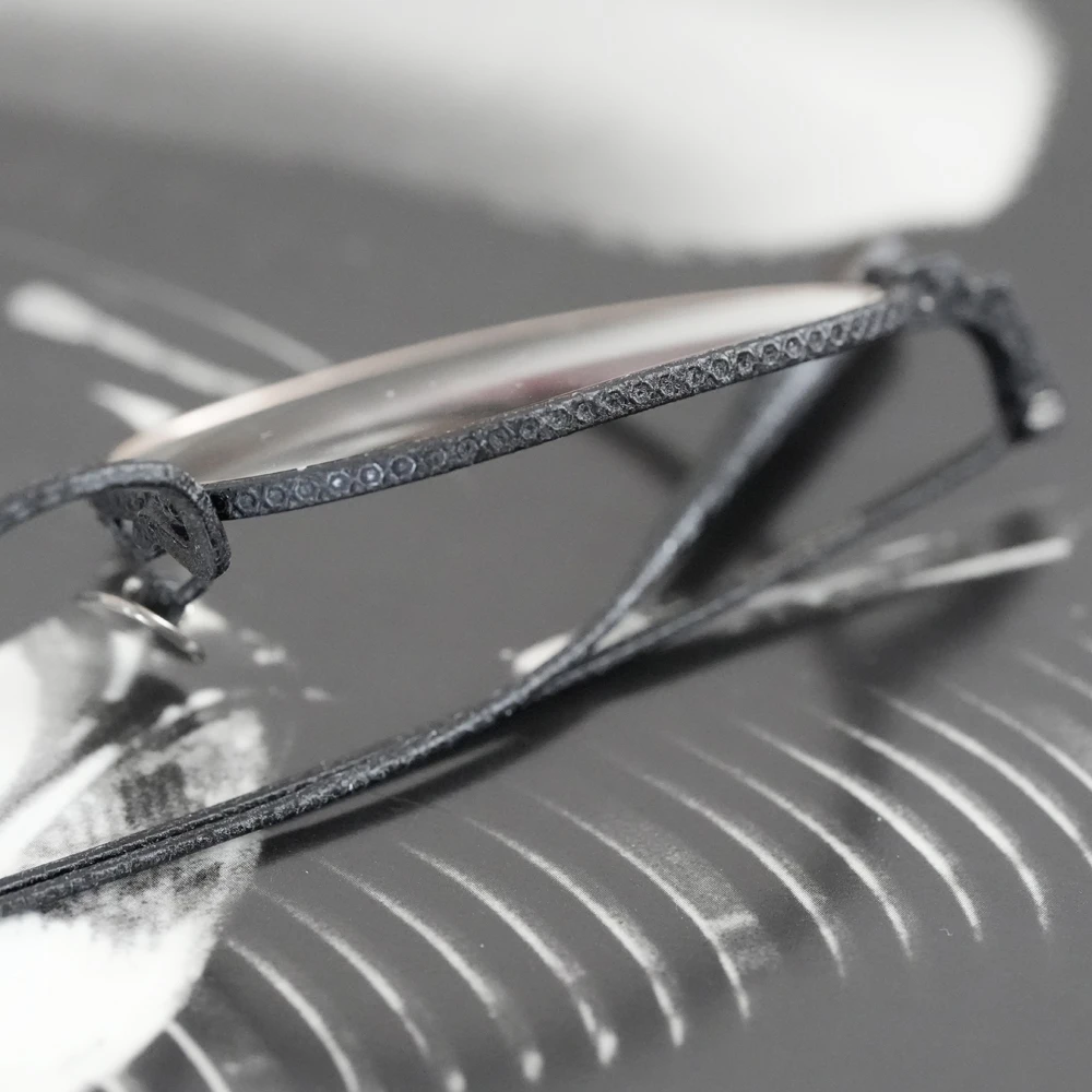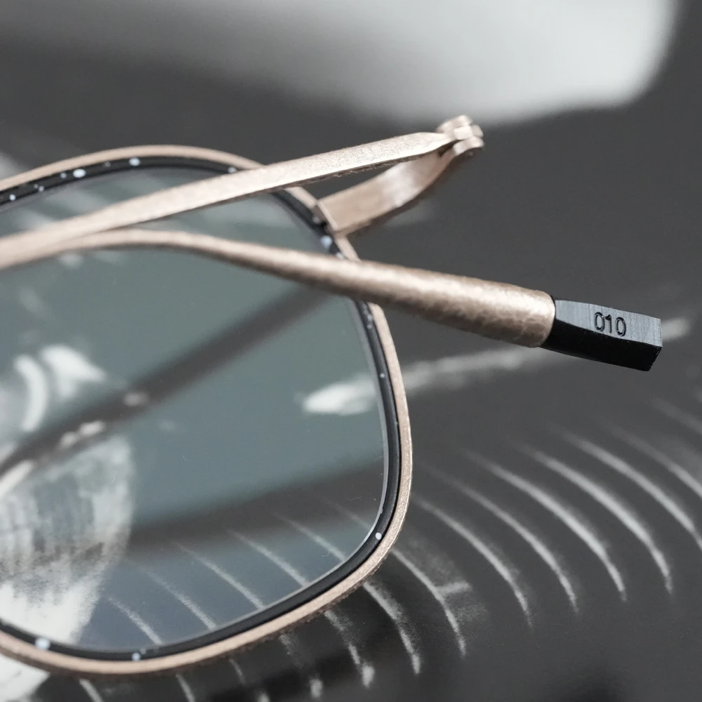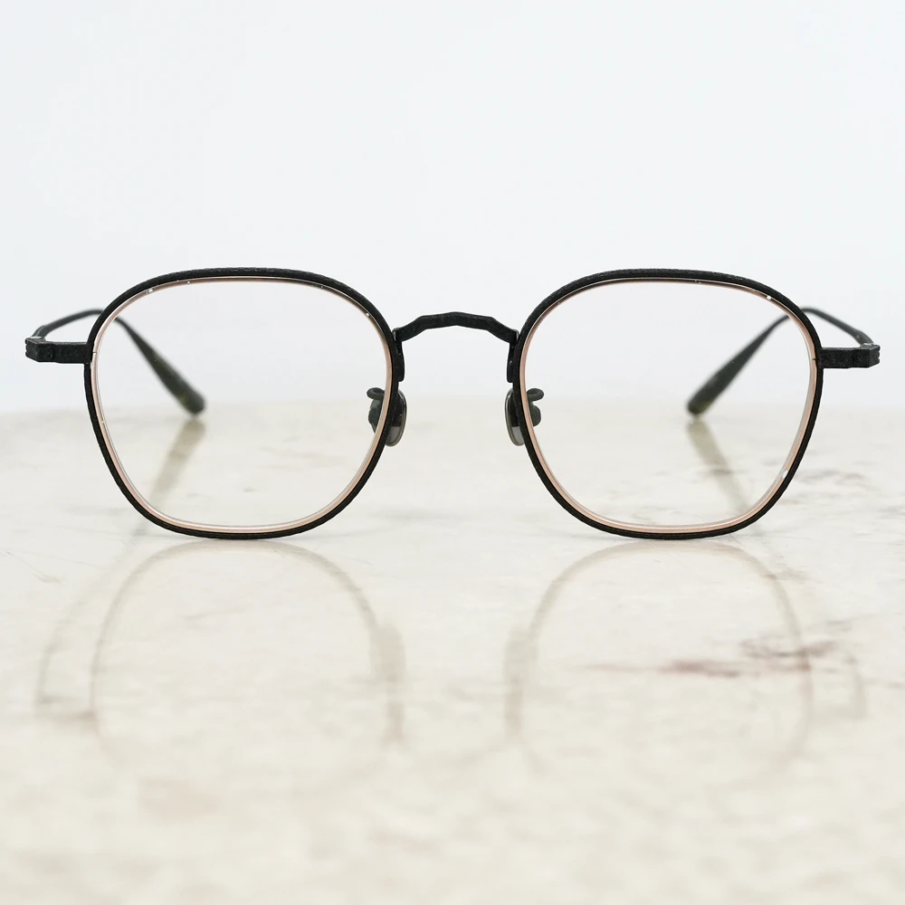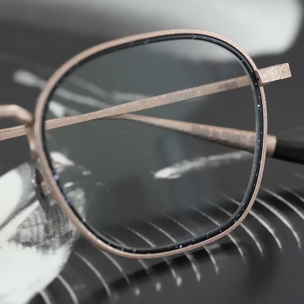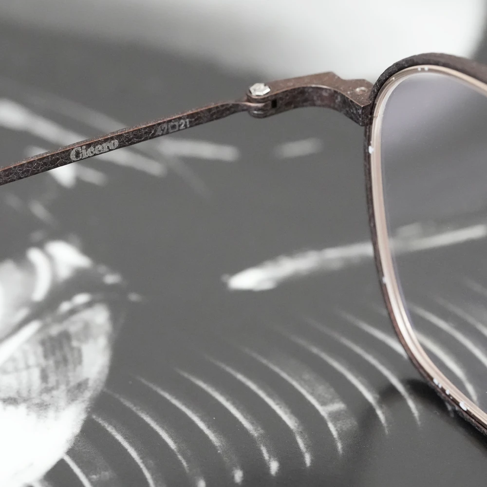 やや大きめサイズの優しいスクエアシェイプは性別問わずお勧めです。チタン素材のメガネを開発した業界の賢人に敬意を払いつつ新しい、最先端のシュリンク技術でチタンの新たな表情を生み出した存在感と力強さのあるメタルフレーム。メタルリムには絵画でも使用されるスパッタリングによりランダムな模様が付けられています。各色200本の限定生産、ブランドマークの六角形型のモダンエンドはシリアル番号入り。また、三角型のチタンパッドは左側に「芸術」、右側に「嘘と」の刻印が施されています。モデル名の「キケロ」は、古代ローマの偉大な政治家、哲学者の名前から。
