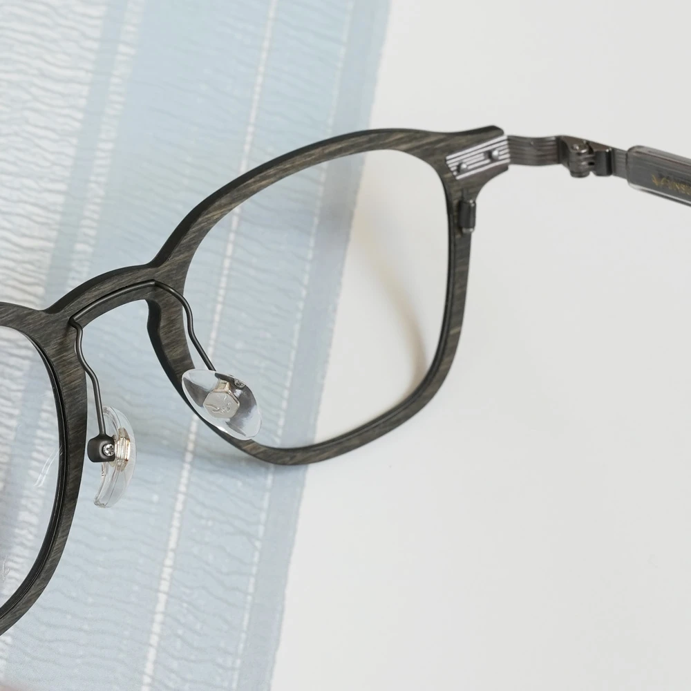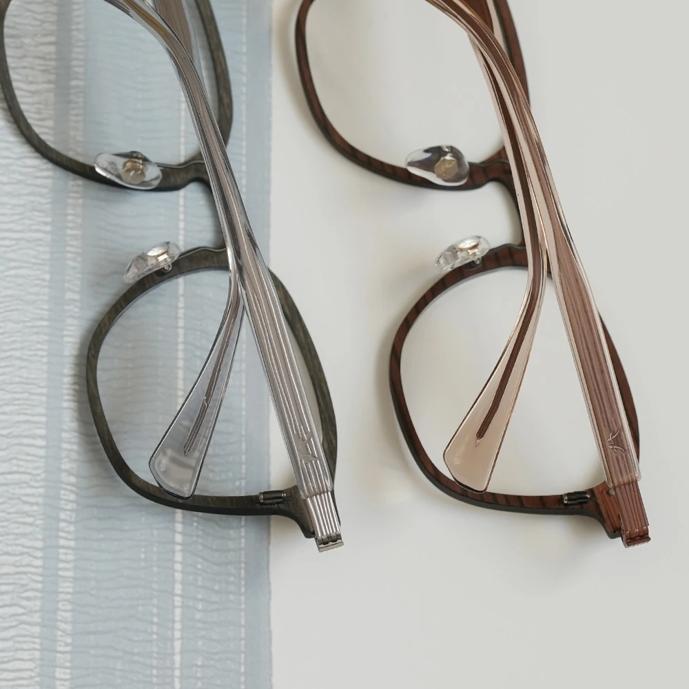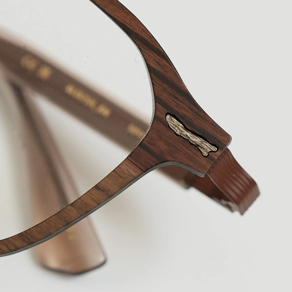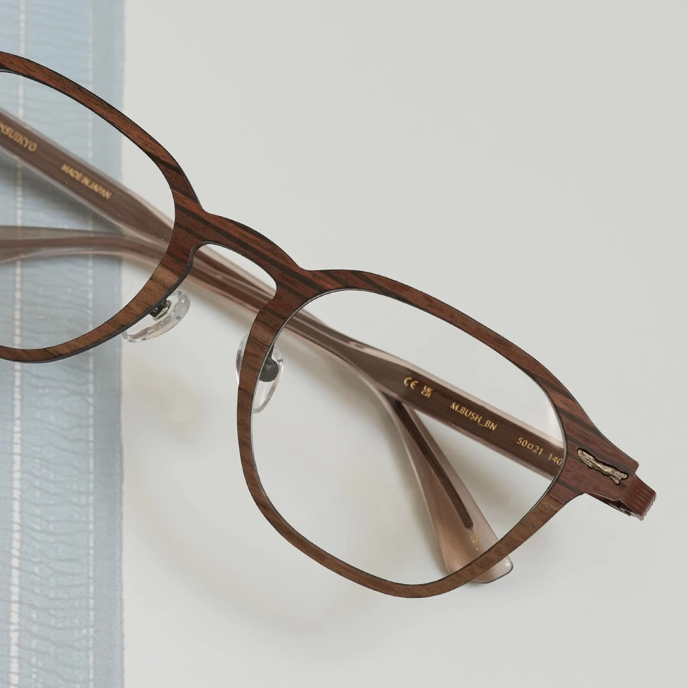 カーボンファイバーに薄い木材を貼り合わせたフロントリムとチタンバーを組み合わせた軽さも魅力のスクエアシェイプのコンビネーションフレーム。ゆったりしたサイズはお顔の大きい方にもお勧め、また、女性がビッグサイズで着用してもチャーミングなデザインです。テンプルは不規則なラインが入ったステンレス製、弾力性がありフィット感も抜群です。モデル名の通り「ブッシュ(茂み)」からの着想です。