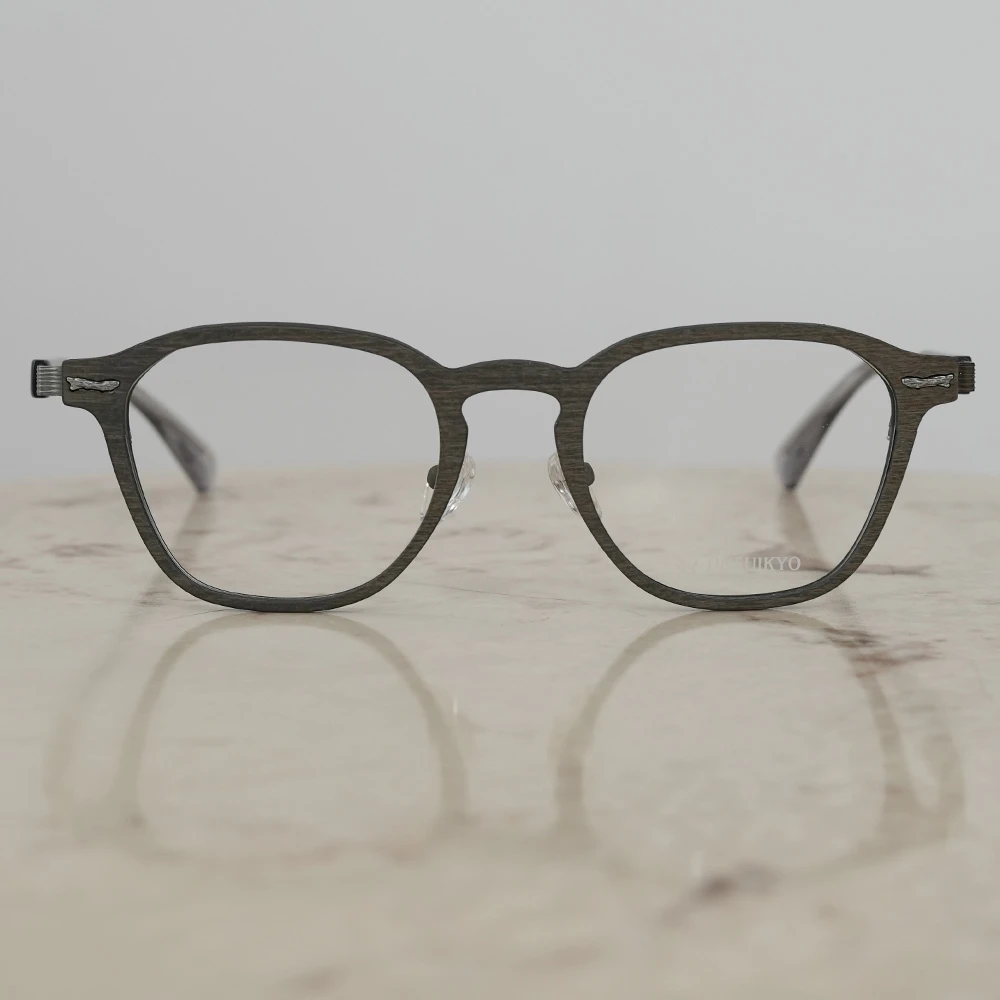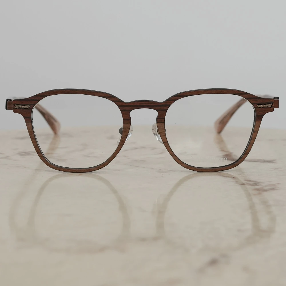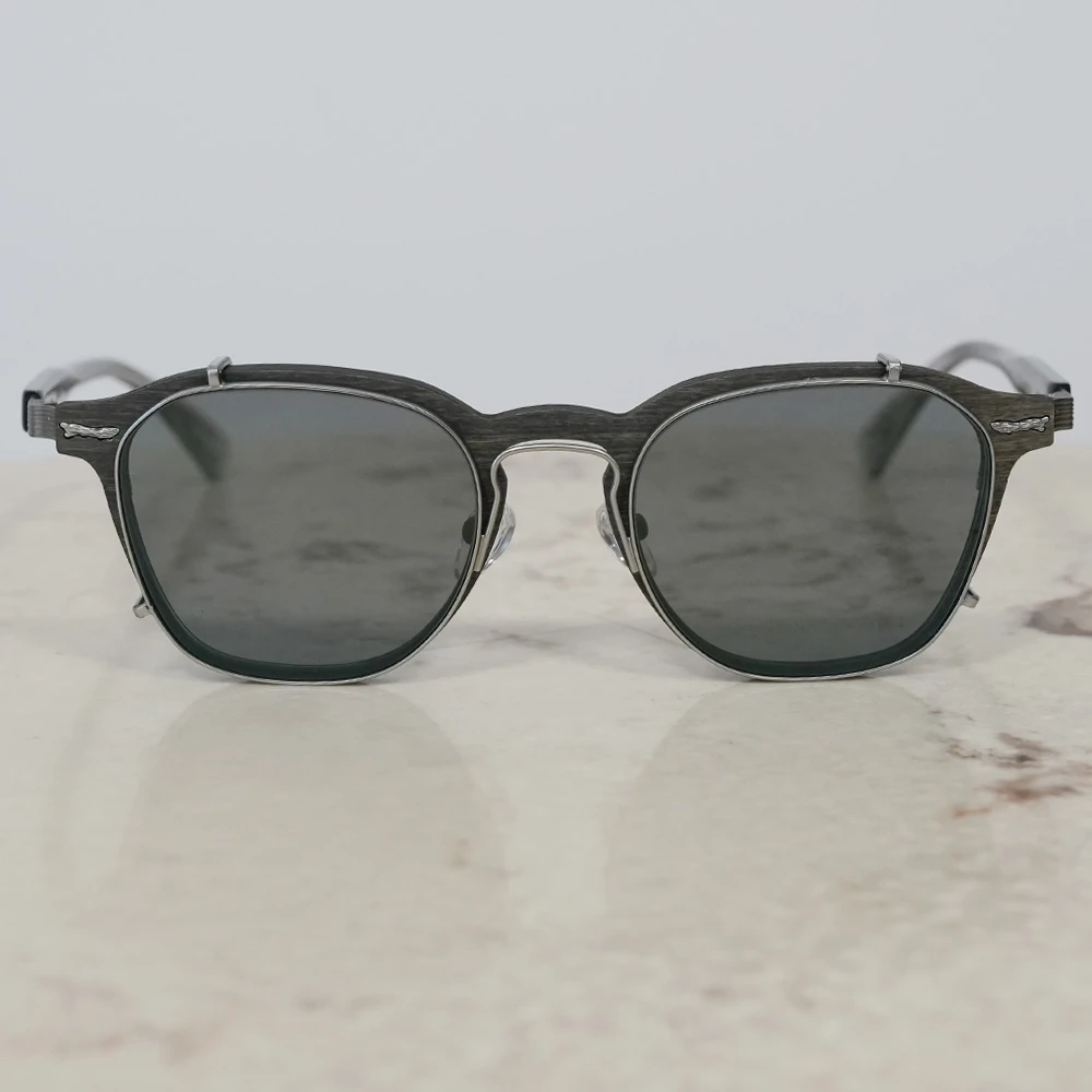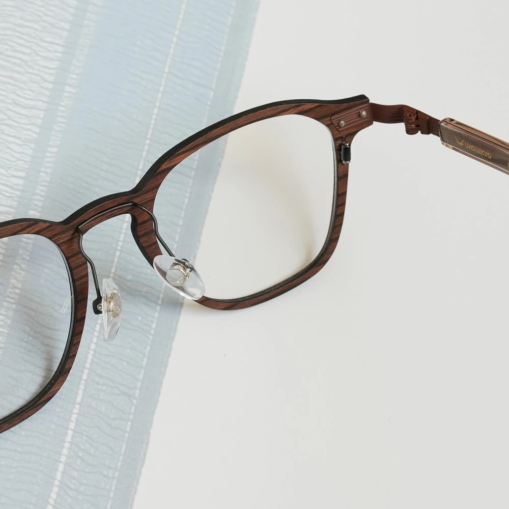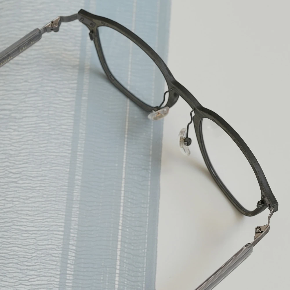 カーボンファイバーに薄い木材を貼り合わせたフロントリムとチタンバーを組み合わせた軽さも魅力のスクエアシェイプのコンビネーションフレーム。ゆったりしたサイズはお顔の大きい方にもお勧め、また、女性がビッグサイズで着用してもチャーミングなデザインです。テンプルは不規則なラインが入ったステンレス製、弾力性がありフィット感も抜群です。モデル名の通り「ブッシュ(茂み)」からの着想です。