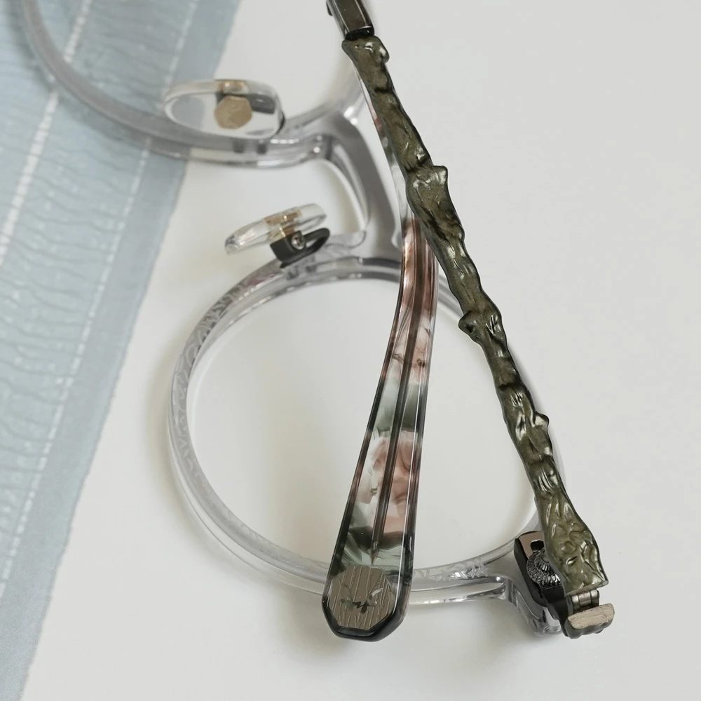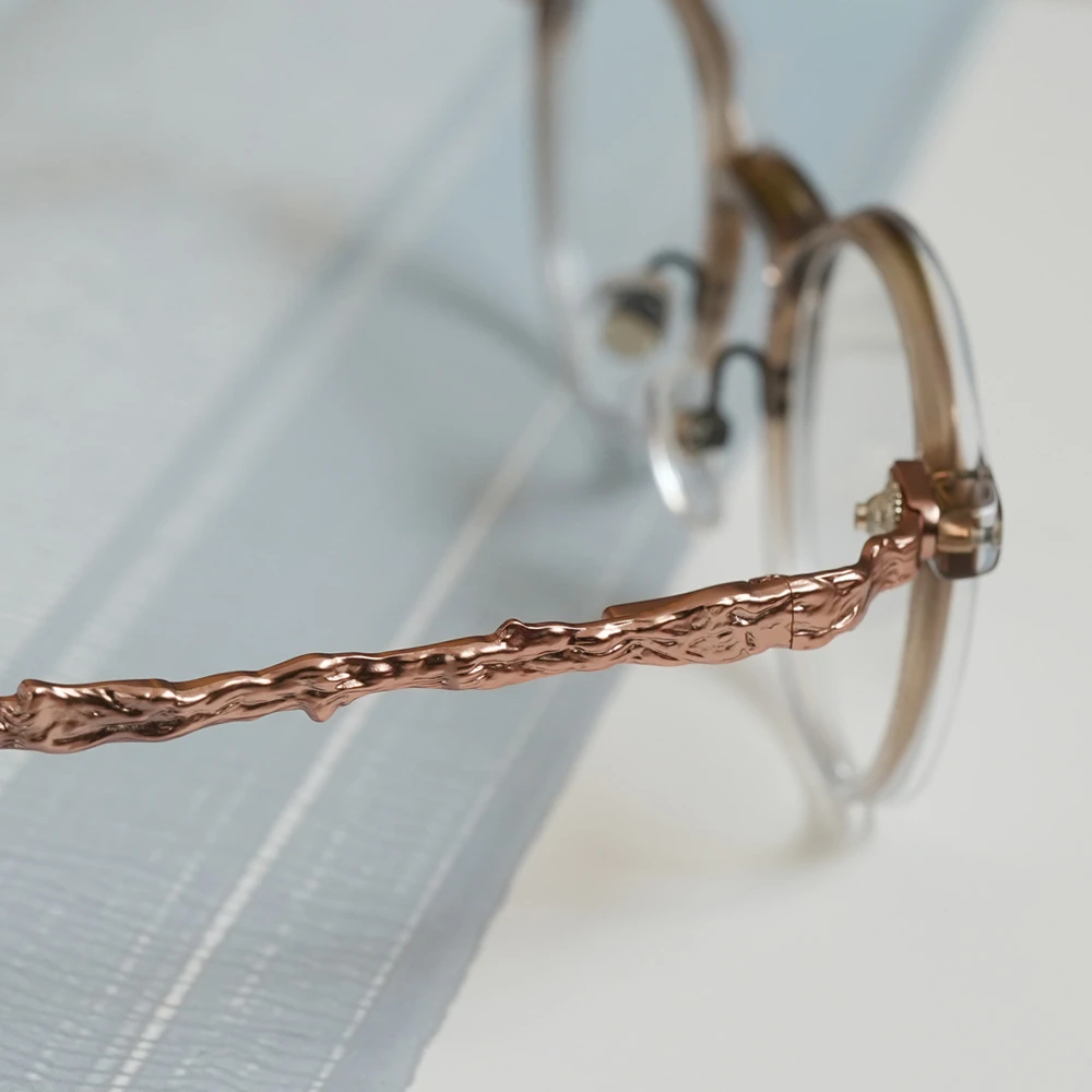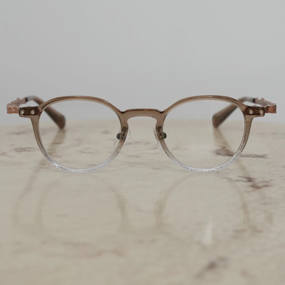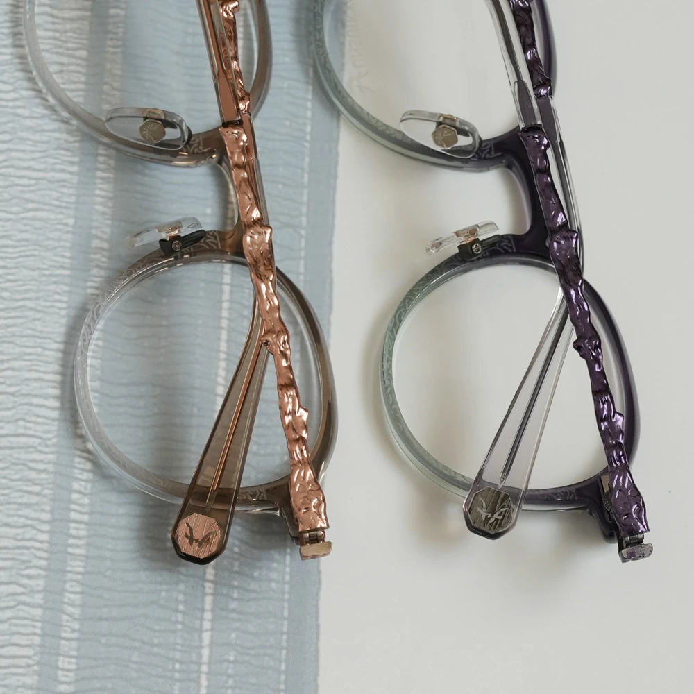 下側に気泡の入った特別なアセテートプラスチック生地を採用したパントフレーム。ニュアンスのあるカラーが非常に美しいメガネです。縄文杉の幹の模様をトレースしたテンプルは外側に広がるバネ蝶番採用、フロント裏側、両サイドのネジを調整することで幅を広げることのできるギミックもユニークです。