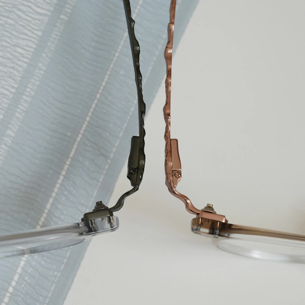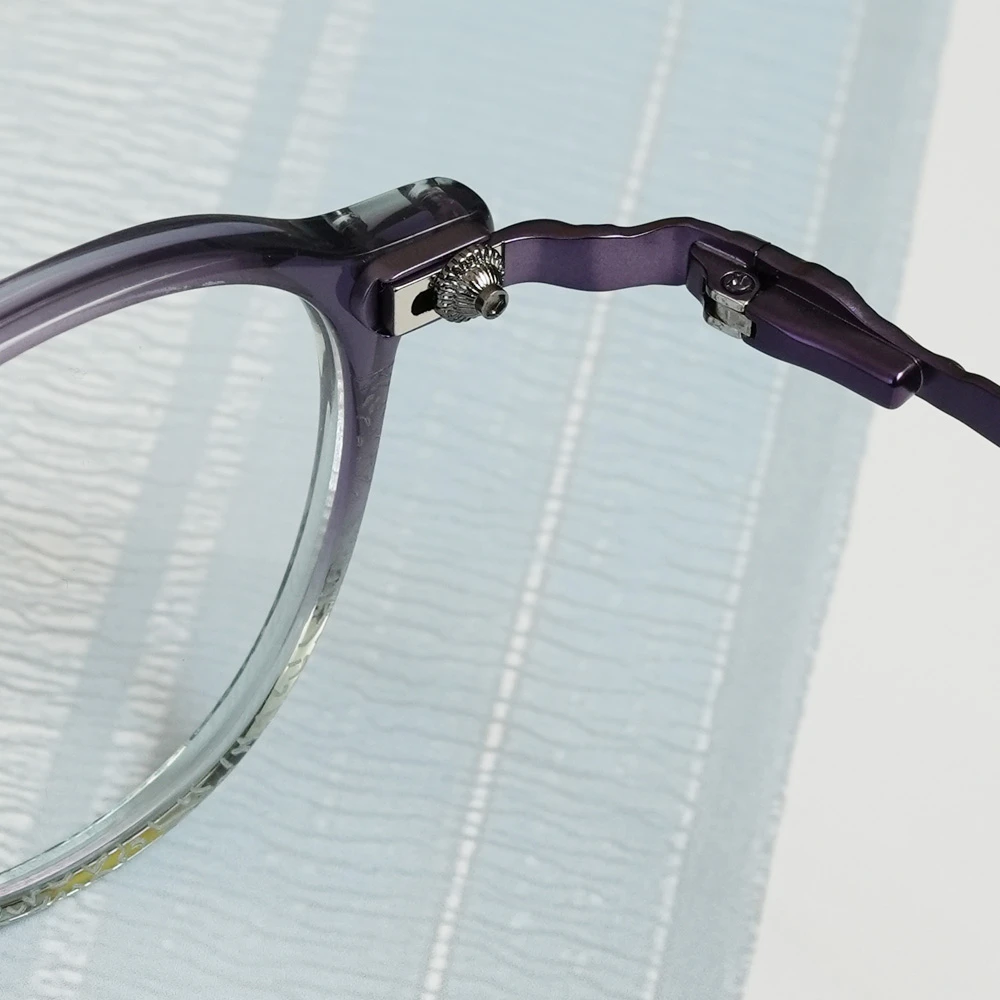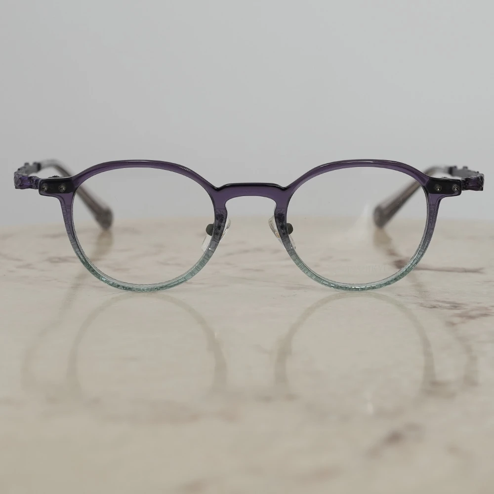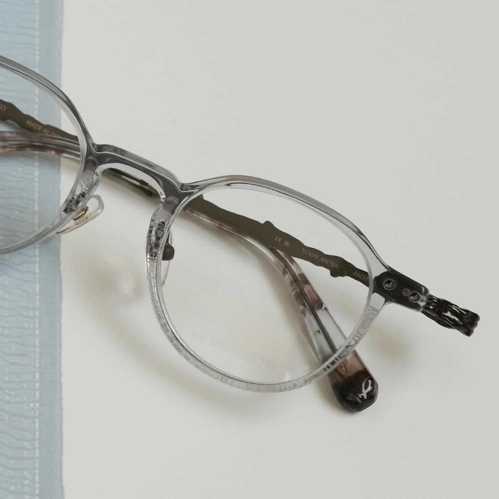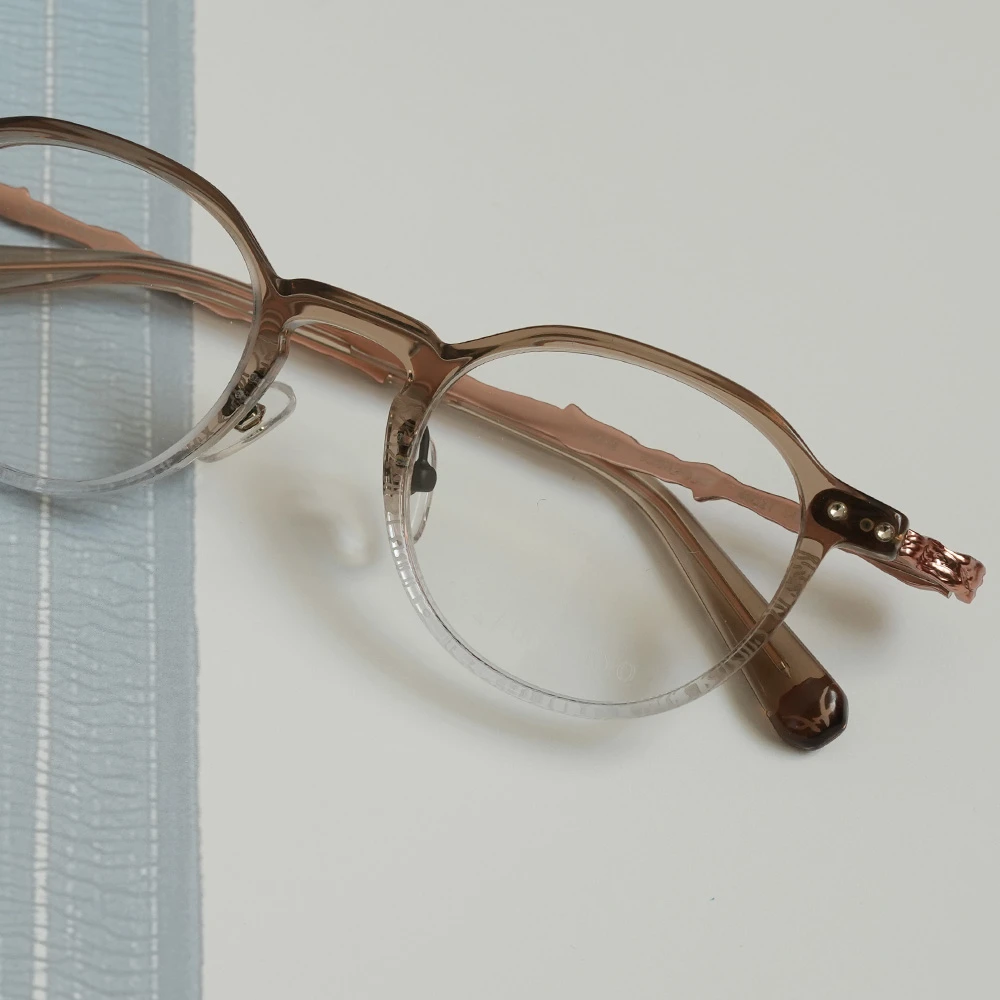 下側に気泡の入った特別なアセテートプラスチック生地を採用したパントフレーム。ニュアンスのあるカラーが非常に美しいメガネです。縄文杉の幹の模様をトレースしたテンプルは外側に広がるバネ蝶番採用、フロント裏側、両サイドのネジを調整することで幅を広げることのできるギミックもユニークです。